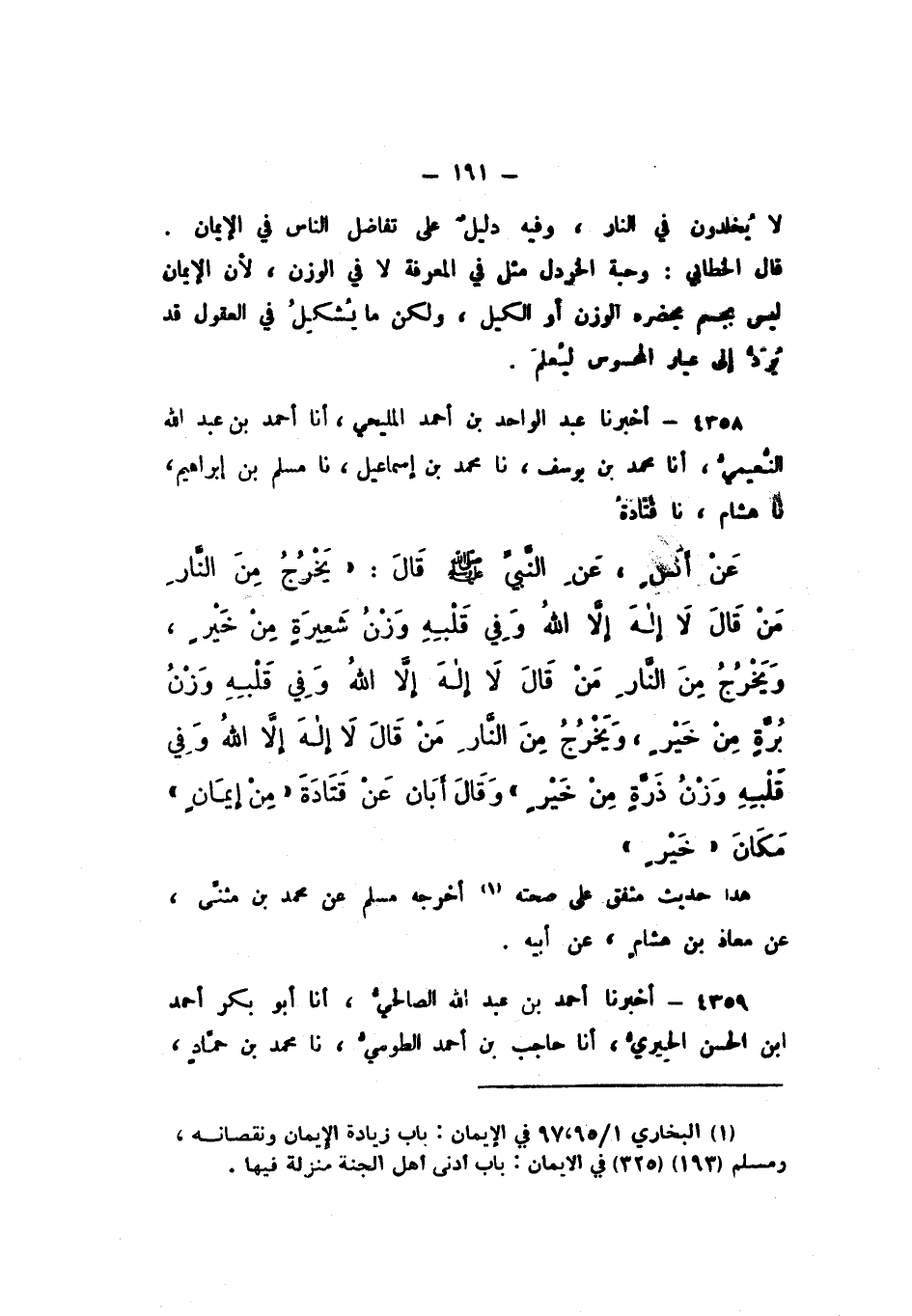 4358 - أَخْبَرَنَا عَبْدُ الْوَاحِدِ بْنُ أَحْمَدَ الْمَلِيحِيُّ، أَنَا أَحْمَدُ بْنُ عَبْدِ اللَّهِ النُّعَيْمِيُّ، أَنَا مُحَمَّدُ بْنُ يُوسُفَ، نَا مُحَمَّدُ بْنُ إِسْمَاعِيلَ، نَا مُسْلِمُ بْنُ إِبْرَاهِيمَ، نَا هِشَامٌ، نَا قَتَادَةُ، عَنْ أَنَسٍ، عَنِ النَّبِيِّ صَلَّى اللهُ عَلَيْهِ وَسَلَّمَ، قَالَ: " يَخْرُجُ مِنَ النَّارِ مَنْ قَالَ: لَا إِلَهَ إِلا اللَّهُ، وَفِي قَلْبِهِ وَزْنُ شَعِيرَةٍ مِنْ خَيْرٍ، وَيَخْرُجُ مِنَ النَّارِ مَنْ قَالَ: لَا إِلَهَ إِلا اللَّهُ، وَفِي قَلْبِهِ وَزْنُ بُرَّةٍ مِنْ خَيْرٍ، يَخْرُجُ مِنَ النَّارِ مَنْ قَالَ: لَا إِلَهَ إِلا اللَّهُ، وَفِي قَلْبِهِ وَزْنُ ذَرَّةٍ مِنْ خَيْرٍ ".