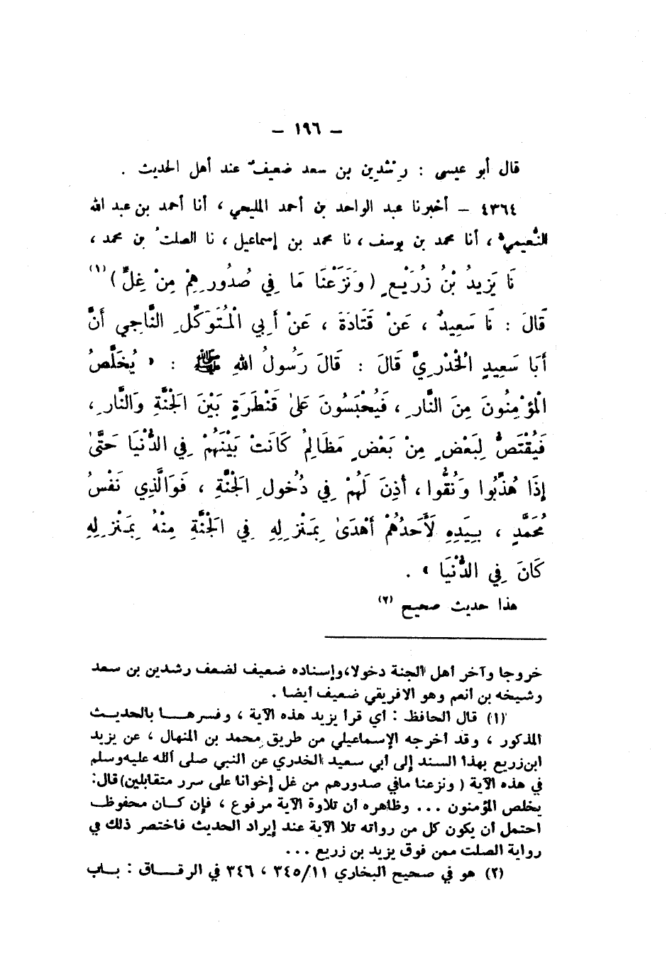 4364 - أَخْبَرَنَا عَبْدُ الْوَاحِدِ بْنُ أَحْمَدَ الْمَلِيحِيُّ، أَنَا أَحْمَدُ بْنُ عَبْدِ اللَّهِ النُّعَيْمِيُّ، أَنَا مُحَمَّدُ بْنُ يُوسُفَ، نَا مُحَمَّدُ بْنُ إِسْمَاعِيلَ، نَا الصَّلْتُ بْنُ مُحَمَّدٍ، نَا يَزِيدُ بْنُ زُرَيْعٍ: {وَنَزَعْنَا مَا فِي صُدُورِهِمْ مِنْ غِلٍّ} [الْأَعْرَاف: 43]، قَالَ: نَا سَعِيدٌ، عَنْ قَتَادَةَ، عَنْ أَبِي الْمُتَوَكِّلِ النَّاجِيِّ، أَنَّ أَبَا سَعِيدٍ الْخُدْرِيِّ، قَالَ: قَالَ رَسُولُ اللَّهِ صَلَّى اللهُ عَلَيْهِ وَسَلَّمَ: «يخلص الْمُؤْمِنُونَ مِنَ النَّارِ، فَيُحْبَسُونَ عَلَى قَنْطَرَةٍ بَيْنَ الْجَنَّةِ وَالنَّارِ، فَيُقْتَصُّ لِبَعْضٍ مِنْ بَعْضٍ مَظَالِمُ كَانَتْ بَيْنَهُمْ فِي الدُّنْيَا، حَتَّى إِذَا هُذِّبُوا وَنُقُّوا، أُذِنَ لَهُمْ فِي دُخُولِ الْجَنَّةِ، فَوَالَّذِي نَفْسُ مُحَمَّدٍ بِيَدِهِ، لأَحَدُهُمْ أَهْدَى بِمَنْزِلِهِ فِي الْجَنَّةِ مِنْهُ بِمَنْزِلِهِ كَانَ فِي الدُّنْيَا».