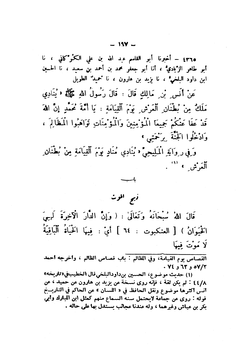 4365 - أَخْبَرَنَا أَبُو الْقَاسِمِ عَبْدُ اللَّهِ بْنُ عَلِيٍّ الْكَرْكَانِيُّ، نَا أَبُو طَاهِرٍ الزِّيَادِيُّ، أَنَا أَبُو جَعْفَرٍ مُحَمَّدُ بْنُ أَحْمَدَ بْنِ سَعِيد، نَا الْحُسَيْنُ بْنُ دَاوُدَ الْبَلْخِيُّ، نَا يَزِيدُ بْنُ هَارُونَ، نَا حُمَيْدٌ الطَّوِيلُ، عَنْ أَنَسِ بْنِ مَالِكٍ، قَالَ: قَالَ رَسُولُ اللَّهِ صَلَّى اللهُ عَلَيْهِ وَسَلَّمَ: " يُنَادِي مَلَكٌ مِنْ بُطْنَانِ الْعَرْشِ يَوْمَ الْقِيَامَةِ: يَا أُمَّةَ مُحَمَّدٍ، إِنَّ اللَّهَ قَدْ عَفَا عَنْكُمْ جَمِيعًا الْمُؤْمِنِينَ وَالْمُؤْمِنَاتِ، تَوَاهَبُوا الْمَظَالِمَ، وَادْخُلُوا الْجَنَّةَ بِرَحْمَتِي ".