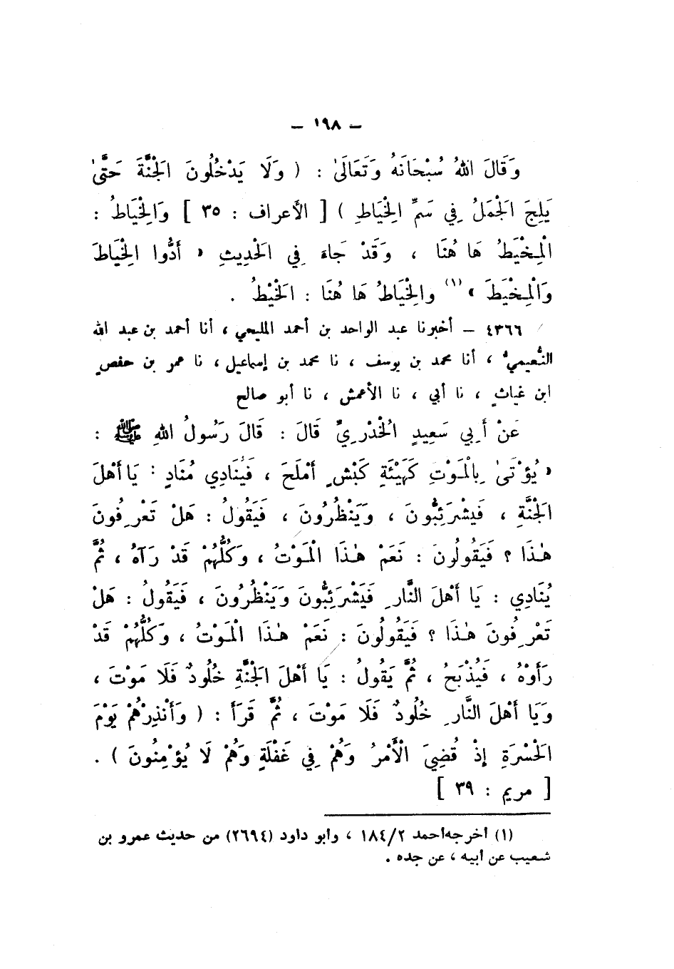 وَكُلُّهُمْ قَدْ رَأَوْهُ، فَيُذْبَحُ، ثُمَّ يَقُولُ: يَا أَهْلَ الْجَنَّةِ، خُلُودٌ فَلا مَوْتَ، وَيَا أَهْلَ النَّارِ، خُلُودٌ فَلا مَوْتَ، ثُمَّ قَرَأَ: {وَأَنْذِرْهُمْ يَوْمَ الْحَسْرَةِ إِذْ قُضِيَ الأَمْرُ وَهُمْ فِي غَفْلَةٍ وَهُمْ لَا يُؤْمِنُونَ} [مَرْيَم: 39] ".