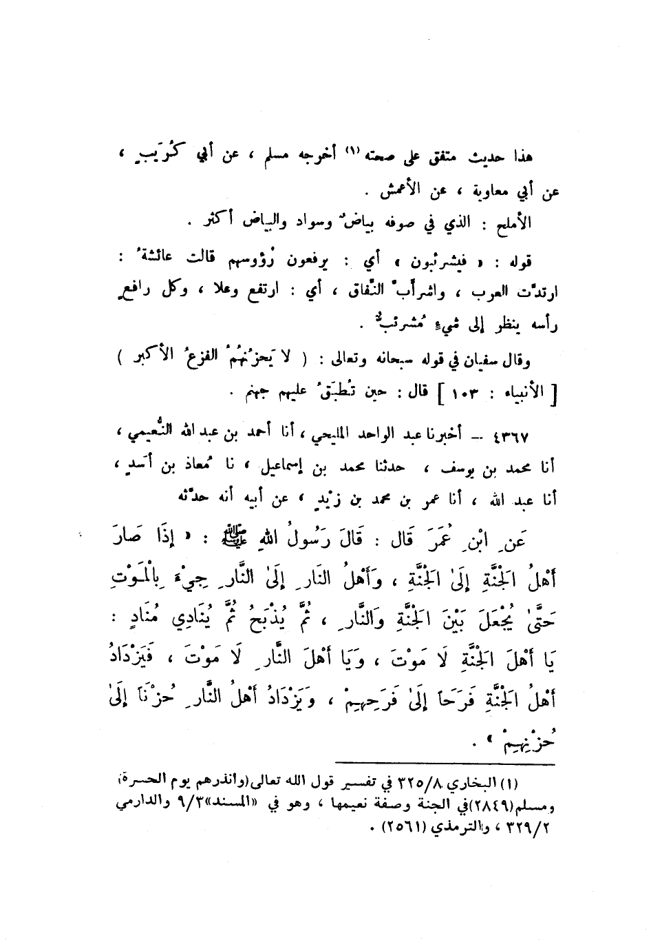 4367 - أَخْبَرَنَا عَبْدُ الْوَاحِدِ الْمَلِيحِيُّ، أَنَا أَحْمَدُ بْنُ عَبْدِ اللَّهِ النُّعَيْمِيُّ، أَنَا مُحَمَّدُ بْنُ يُوسُفَ، نَا مُحَمَّدُ بْنُ إِسْمَاعِيلَ، نَا مُعَاذُ بْنُ أَسَدٍ، أَنَا عَبْدُ اللَّهِ، أَنَا عُمَرُ بْنُ مُحَمَّدِ بْنِ زَيْدٍ، عَنْ أَبِيهِ، أَنَّهُ حَدَّثَهُ عَنِ ابْنِ عُمَرَ، قَالَ: قَالَ رَسُولُ اللَّهِ صَلَّى اللهُ عَلَيْهِ وَسَلَّمَ: " إِذَا صَارَ أَهْلُ الْجَنَّةِ إِلَى الْجَنَّة، وَأَهْلُ النَّارِ إِلَى النَّارِ، جِيءَ بِالْمَوْتِ حَتَّى يُجْعَلَ بَيْنَ الْجَنَّةِ وَالنَّارِ، ثُمَّ يُذْبَحُ، ثُمَّ يُنَادِي مُنَادٍ: يَا أَهْلَ الْجَنَّةِ، لَا مَوْتَ، وَيَا أَهْلَ النَّارِ، لَا مَوْتَ، فَيَزْدَادُ أَهْلُ الْجَنَّةِ فَرَحًا إِلَى فَرَحِهِمْ، وَيَزْدَادُ أَهْلُ النَّارِ حُزْنًا إِلَى حُزْنِهِمْ ".