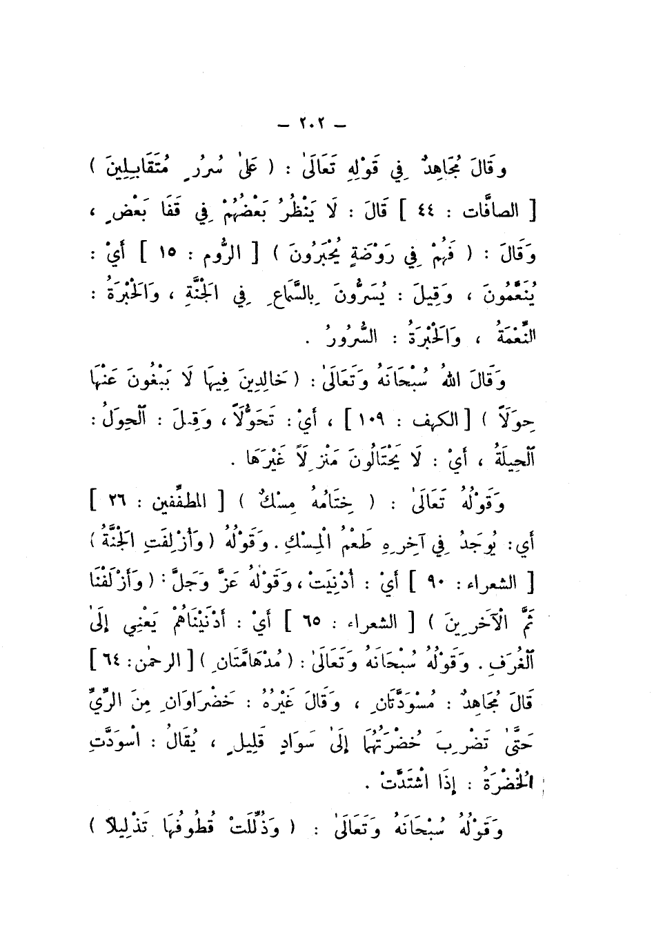 وَقَوله سُبْحَانَهُ وَتَعَالَى: {مُدْهَامَّتَانِ} [الرَّحْمَن: 64]، قَالَ مُجَاهِد: مسودتان، وَقَالَ غَيْرُهُ: خضراوان من الرّيّ حَتَّى تضرب خضرتهما إِلَى سَواد قَلِيل، يُقَالُ: اسودت الخضرة: إِذَا اشتدت.