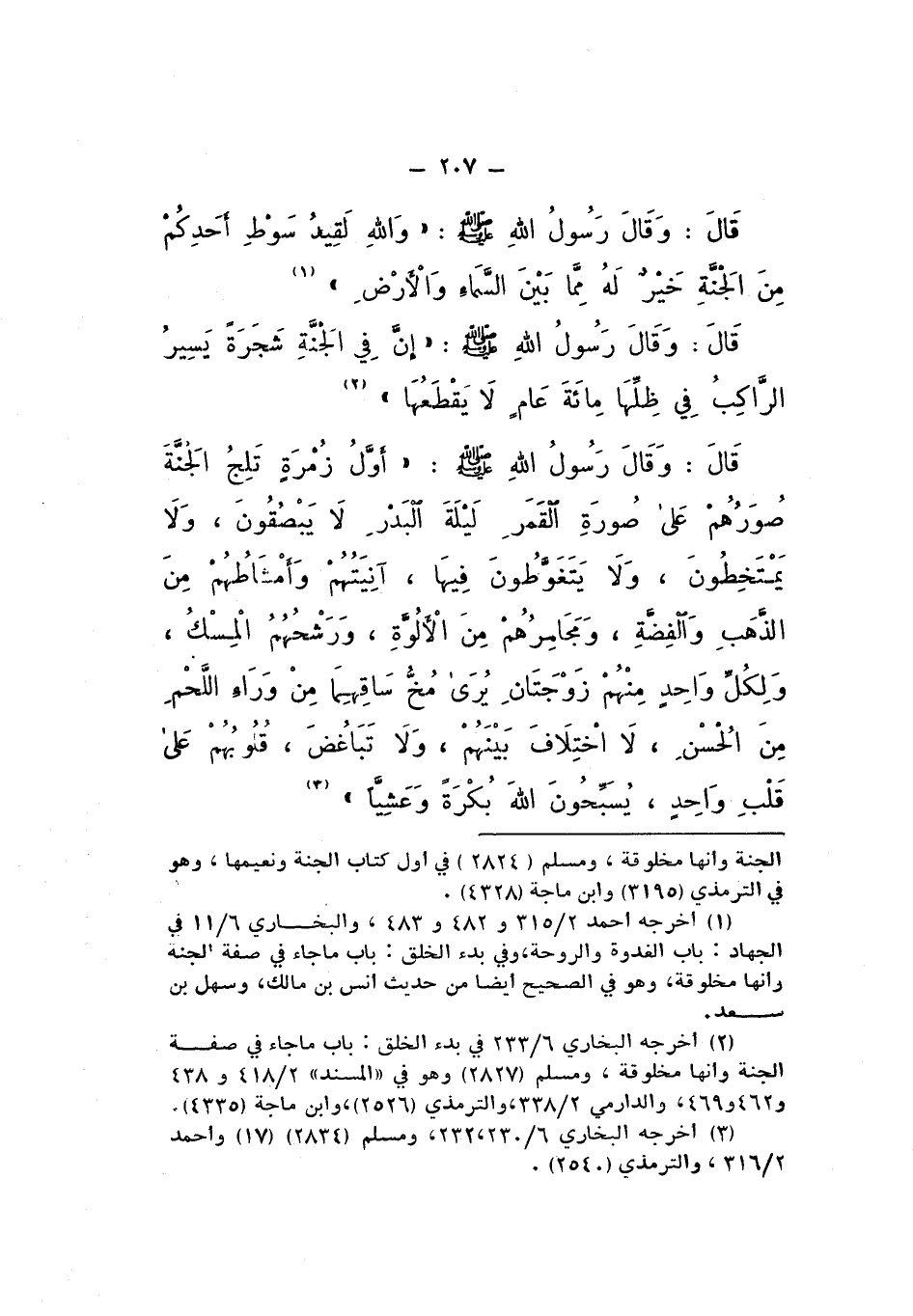 4370 - قَالَ: وَقَالَ رَسُولُ اللَّهِ صَلَّى اللهُ عَلَيْهِ وَسَلَّمَ: «أَوَّلُ زُمْرَةٍ تَلِجُ الْجَنَّةَ صُوَرُهُمْ عَلَى صُورَةِ الْقَمَرِ لَيْلَةَ الْبَدْرِ لَا يَبْصُقُونَ، وَلا يَمْتَخِطُونَ، وَلا يَتَغَوَّطُونَ فِيهَا، آنِيَتُهُمْ وَأَمْشَاطُهُمْ مِنَ الذَّهَبِ وَالْفِضَّةِ، وَمَجَامِرُهُمْ مِنَ الأَلُوَّةِ، وَرَشْحُهُمُ الْمِسْكُ، وَلِكُلِّ وَاحِدٍ مِنْهُمْ زَوْجَتَانِ يُرَى مُخُّ سَاقِهِمَا مِنْ وَرَاءِ اللَّحْمِ مِنَ الْحَسَنِ، لَا اخْتِلافَ بَيْنَهُمْ، وَلا تَبَاغُضَ، قُلُوبُهُمْ عَلَى قَلْبٍ وَاحِدٍ، يُسَبِّحُونَ اللَّهَ بُكْرَةً وَعَشِيًّا»