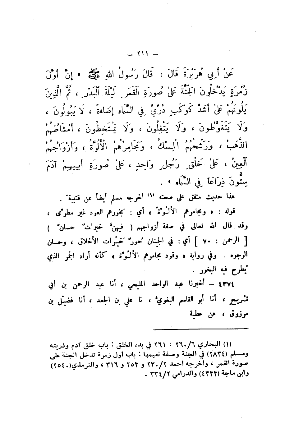 عَنْ أَبِي هُرَيْرَةَ، قَالَ: قَالَ رَسُولُ اللَّهِ صَلَّى اللهُ عَلَيْهِ وَسَلَّمَ: «إِنَّ أَوَّلَ زُمْرَةٍ يَدْخُلُونَ الْجَنَّةَ عَلَى صُورَةِ الْقَمَرِ لَيْلَةَ الْبَدْرِ، ثُمَّ الَّذِينَ يَلُونَهُمْ عَلَى أَشَدِّ كَوْكَبٍ دُرِّيٍّ فِي السَّمَاءِ إِضَاءَةً، لَا يَبُولُونَ، وَلا يَتَغَوَّطُونَ، وَلا يَتْفُلُونَ، وَلا يَمْتَخِطُونَ، أَمْشَاطُهُمُ الذَّهَبُ، وَرَشْحُهُمُ الْمِسْكُ، وَمَجَامِرُهُمُ الأَلُوَّةِ، وَأَزْوَاجُهُمُ الْعِينُ، عَلَى خَلْقِ رَجُلٍ وَاحِدٍ، عَلَى صُورَةِ أَبِيهِمْ آدَمَ سِتُّونَ ذِرَاعًا فِي السَّمَاءِ».