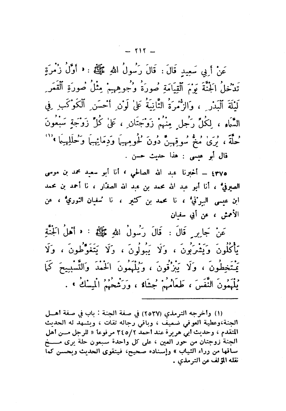 عَنْ أَبِي سَعِيدٍ، قَالَ: قَالَ رَسُولُ اللَّهِ صَلَّى اللهُ عَلَيْهِ وَسَلَّمَ: «أَوَّلُ زُمْرَةٍ تَدْخُلُ الْجَنَّةَ يَوْمَ الْقِيَامَةِ صُورَةُ وُجُوهِهِمْ مِثْلُ صُورَةِ الْقَمَرِ لَيْلَةَ الْبَدْرِ، وَالزُّمْرَةُ الثَّانِيَةُ عَلَى لَوْنِ أَحْسَنِ الْكَوْكَبِ فِي السَّمَاءِ، لِكُلِّ رَجُلٍ مِنْهُمْ زَوْجَتَانِ، عَلَى كُلِّ زَوْجَةٍ سَبْعُونَ حُلَّةً، يُرَى مُخُّ سُوقِهِنَّ دُونَ لُحُومِهِمَا، وَدِمَائِهِمَا، وَحُلَلِهِمَا».