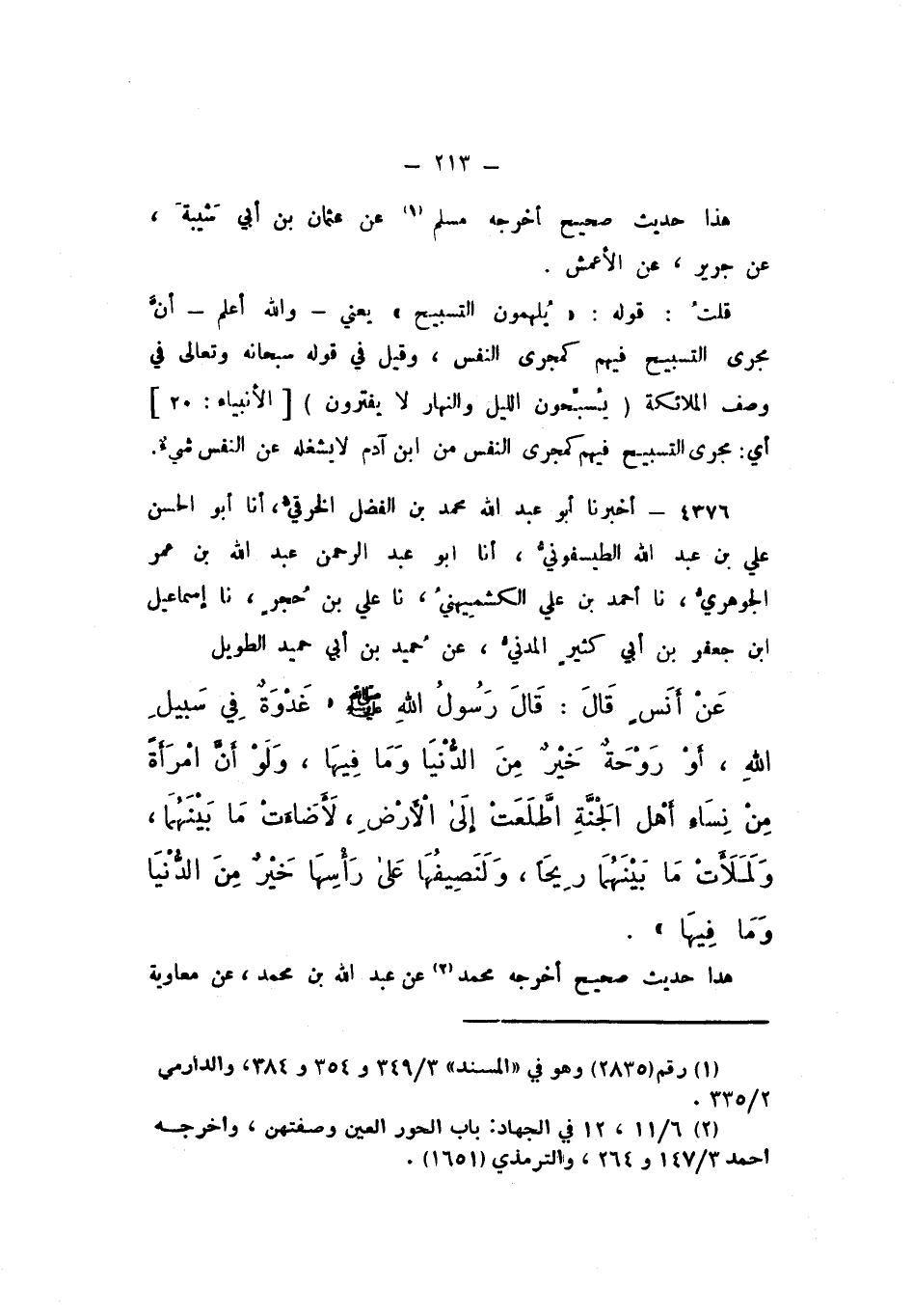 4376 - أَخْبَرَنَا أَبُو عَبْدِ اللَّهِ مُحَمَّدُ بْنُ الْفَضْلِ الْخِرَقِيُّ، أَنَا أَبُو الْحَسَنِ عَلِيُّ بْنُ عَبْدِ اللَّهِ الطَّيْسَفُونِيُّ، أَنَا أَبُو عَبْدِ الرَّحْمَنِ عَبْدُ اللَّهِ بْنُ عُمَرَ الْجَوْهَرِيُّ , نَا أَحْمَدُ بْنُ عَلِي الْكُشْمِيهَنِيُّ، نَا عَلِيُّ بْنُ حُجْرٍ، نَا إِسْمَاعِيلُ بْنُ جَعْفَرِ بْنِ أَبِي كَثِيرٍ الْمَدَنِيُّ، عَنْ حُمَيْدِ بْنِ أَبِي حُمَيْدٍ الطَّوِيلِ، عَنْ أَنَسٍ، قَالَ: قَالَ رَسُولُ اللَّهِ صَلَّى اللهُ عَلَيْهِ وَسَلَّمَ: «غَدْوَةٌ فِي سَبِيلِ اللَّهِ، أَوْ رَوْحَةٌ خَيْرٌ مِنَ الدُّنْيَا وَمَا فِيهَا، وَلَوْ أَنَّ امْرَأَةً مِنْ نِسَاءِ أَهْلِ الْجَنَّةِ اطَّلَعَتْ إِلَى الأَرْضِ لأَضَاءَتْ مَا بَيْنَهُمَا، وَلَمَلأَتْ مَا بَيْنَهُمَا رِيحًا، وَلَنَصِيفُهَا عَلَى رَأْسِهَا خَيْرٌ مِنَ الدُّنْيَا وَمَا فِيهَا».