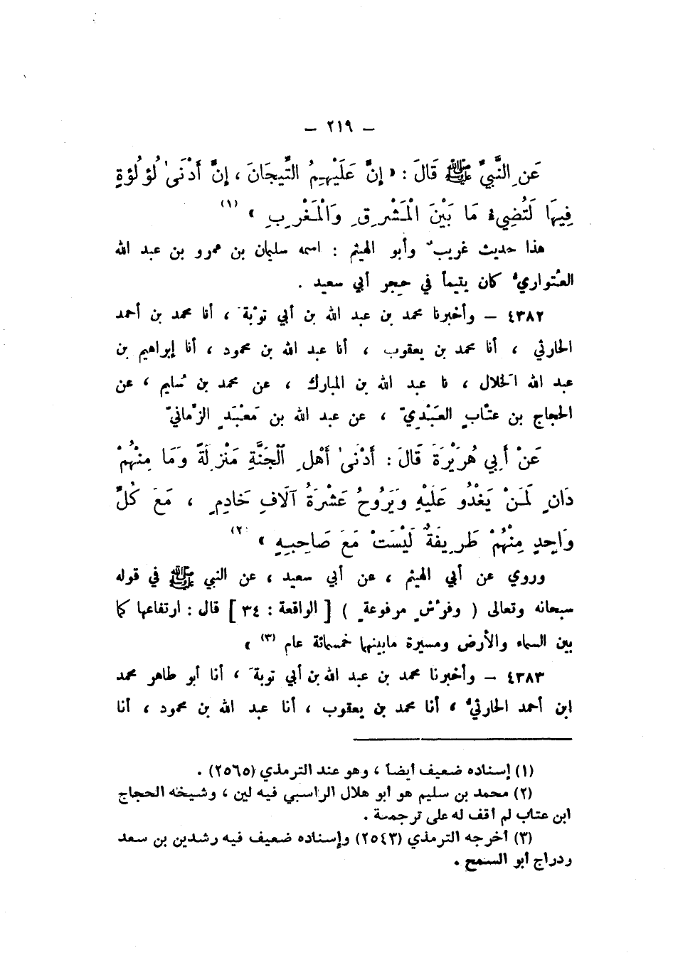4382 - وَأَخْبَرَنَا مُحَمَّدُ بْنُ عَبْدِ اللَّهِ بْنِ أَبِي تَوْبَةَ، أَنَا مُحَمَّدُ بْنُ أَحْمَدَ الْحَارِثِيُّ، أَنَا مُحَمَّدُ بْنُ يَعْقُوبَ، أَنَا عَبْدُ اللَّهِ بْنُ مَحْمُودٍ، أَنَا إِبْرَاهِيمُ بْنُ عَبْدِ اللَّهِ الْخَلالُ، نَا عَبْدُ اللَّهِ بْنُ الْمُبَارَكِ، عَنْ مُحَمَّدِ بْنِ سُلَيْمٍ، عَنِ الْحَجَّاجِ بْنِ عَتَّابٍ الْعَبْدِيِّ، عَنْ عَبْدِ اللَّهِ بْنِ مَعْبَدٍ الزِّمَّانِيِّ، عَنْ أَبِي هُرَيْرَةَ، قَالَ: «أَدْنَى أَهْلِ الْجَنَّةِ مَنْزِلَةً، وَمَا مِنْهُمْ دَانٍ، لَمَنْ يَغْدُو عَلَيْهِ وَيَرُوحُ عَشْرَةُ آلافِ خَادِمٍ، مَعَ كُلِّ وَاحِدٍ مِنْهُمْ طَرِيفَةٌ لَيْسَتْ مَعَ صَاحِبِهِ».