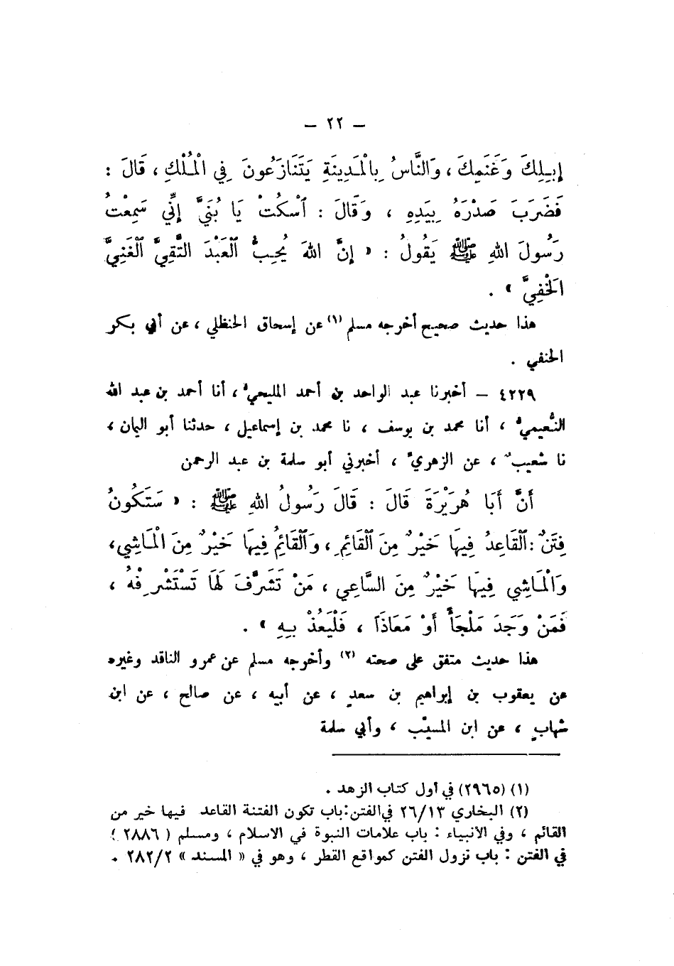 4229 - أَخْبَرَنَا عَبْدُ الْوَاحِدِ بْنُ أَحْمَدَ الْمَلِيحِيُّ، أَنَا أَحْمَدُ بْنُ عَبْدِ اللَّهِ النُّعَيْمِيُّ، أَنَا مُحَمَّدُ بْنُ يُوسُفَ، نَا مُحَمَّدُ بْنُ إِسْمَاعِيلَ، حَدَّثَنَا أَبُو الْيَمَانِ، نَا شُعَيْبٌ، عَنِ الزُّهْرِيِّ، أَخْبَرَنِي أَبُو سَلَمَةَ بْنُ عَبْدِ الرَّحْمَنِ، أَنَّ أَبَا هُرَيْرَةَ، قَالَ: قَالَ رَسُولُ اللَّهِ صَلَّى اللهُ عَلَيْهِ وَسَلَّمَ: " سَتَكُونُ فِتَنٌ: الْقَاعِدُ فِيهَا خَيْرٌ مِنَ الْقَائِمِ، وَالْقَائِمُ فِيهَا خَيْرٌ مِنَ الْمَاشِي، وَالْمَاشِي فِيهَا خَيْرٌ مِنَ السَّاعِي، مَنْ تَشَرَّفَ لَهَا تَسْتَشْرِفْهُ، فَمَنْ وَجَدَ مَلْجَأً أَوْ معَاذًا، فَلْيَعُذْ بِهِ ".