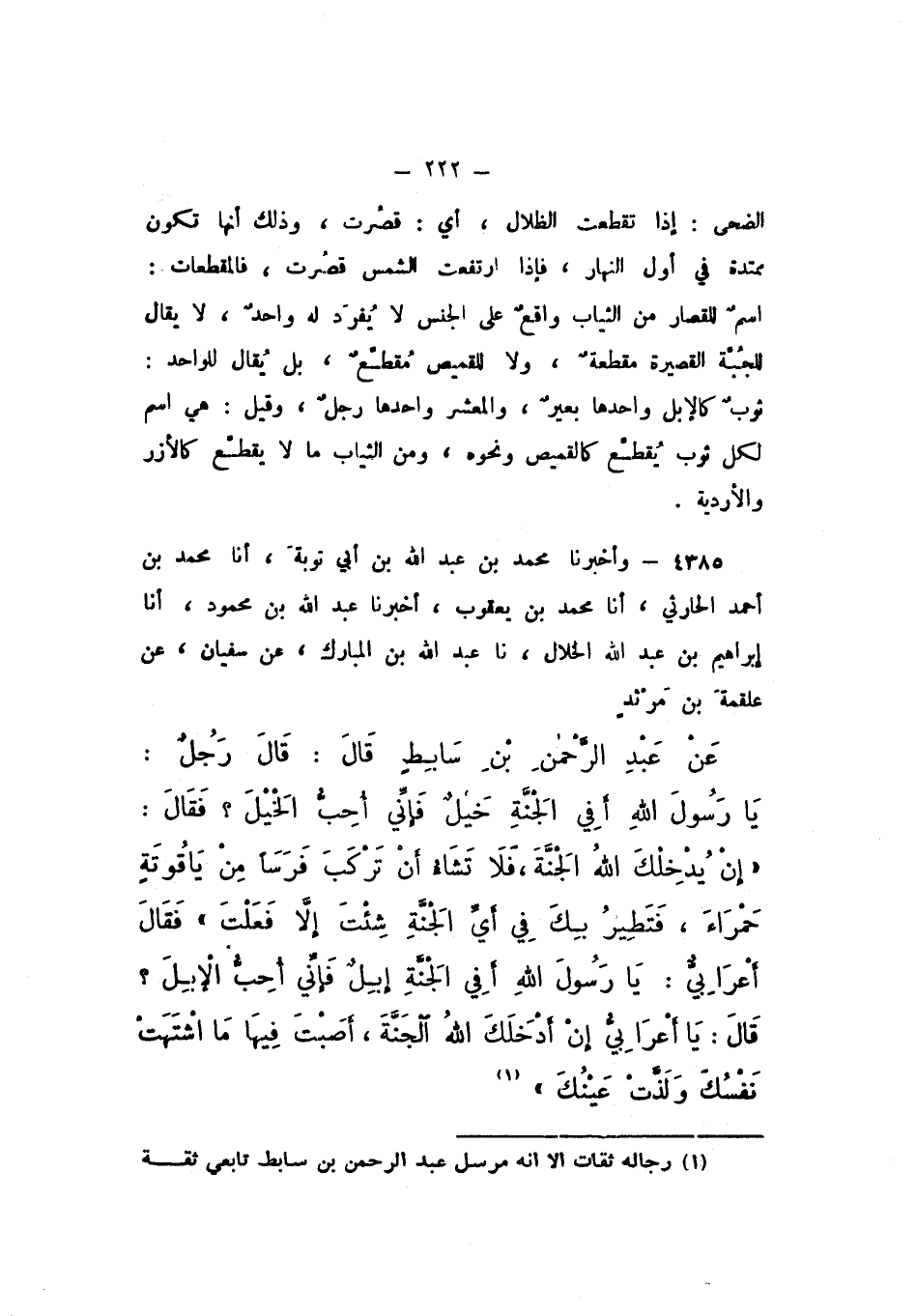 4385 - وَأَخْبَرَنَا مُحَمَّدُ بْنُ عَبْدِ اللَّهِ بْنِ أَبِي تَوْبَةَ، أَنَا مُحَمَّدُ بْنُ أَحْمَدَ الْحَارِثِيُّ، أَنَا مُحَمَّدُ بْنُ يَعْقُوبَ، أَخْبَرَنَا عَبْدُ اللَّهِ بْنُ مَحْمُودٍ، أَنَا إِبْرَاهِيمُ بْنُ عَبْدِ اللَّهِ الْخَلالُ، نَا عَبْدُ اللَّهِ بْنُ الْمُبَارَكِ، عَنْ سُفْيَانَ، عَنْ عَلْقَمَةَ بْنِ مَرْثَدٍ، عَنْ عَبْدِ الرَّحْمَنِ بْنِ سَابِطٍ، قَالَ: قَالَ رَجُلٌ: يَا رَسُولَ اللَّهِ، أَفِي الْجَنَّةِ خَيْلٌ، فَإِنِّي أُحِبُّ الْخَيْلَ؟ فَقَالَ: «إِنْ يُدْخِلْكَ اللَّهُ الْجَنَّةَ، فَلا تَشَاءُ أَنْ تَرْكَبَ فَرَسًا مِنْ يَاقُوتَةٍ حَمْرَاءَ، فَتَطِيرُ بِكَ فِي أَيِّ الْجَنَّةِ شِئْتَ إِلا فَعَلْتَ»، فَقَالَ أَعْرَابِيٌّ: يَا رَسُولَ اللَّهِ، أَفِي الْجَنَّةِ إِبِلٌ، فَإِنِّي أُحِبُّ الإِبِلَ؟ قَالَ: «يَا أَعْرَابِيُّ، إِنْ أَدْخَلَكَ اللَّهُ الْجَنَّةَ، أَصَبْتَ فِيهَا مَا اشْتَهَتْ نَفْسُكَ وَلَذَّتْ عَيْنُكَ».