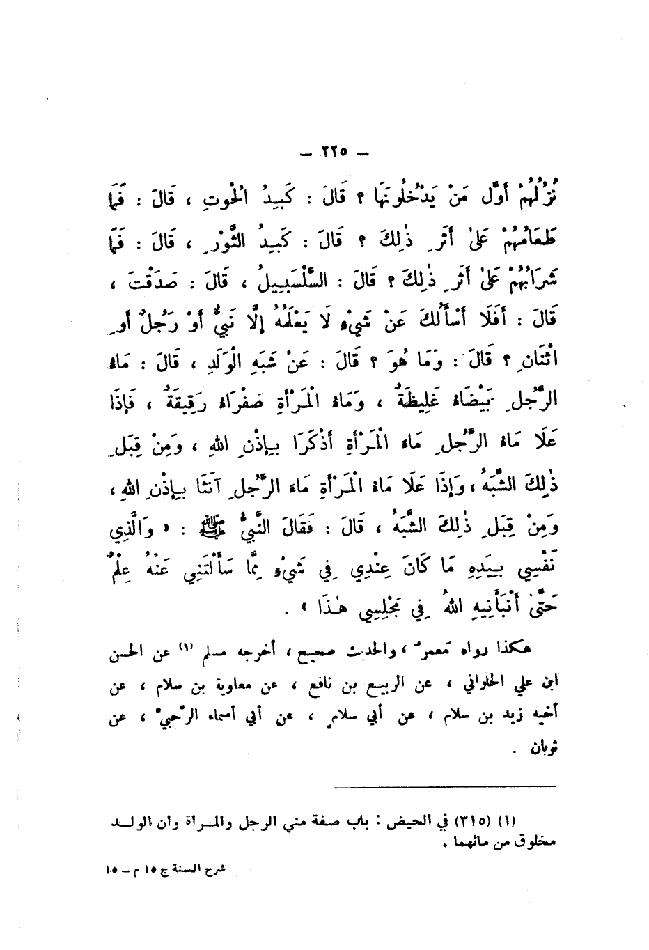 قَالَ: «أَفَلا أَسْأَلُكَ عَنْ شَيْءٍ لَا يَعْلَمُهُ إِلا نَبِيٌّ، أَوْ رَجُلٌ، أَوِ اثْنَانِ؟» قَالَ: وَمَا هُوَ؟ قَالَ: «عَنْ شَبَهِ الْوَلَدِ»، قَالَ: «مَاءُ الرَّجُلِ بَيْضَاءُ غَلِيظَةٌ، وَمَاءُ الْمَرْأَةِ صَفْرَاءُ رَقِيقَةُ، فَإِذَا عَلا مَاءُ الرَّجُلِ مَاءَ الْمَرْأَةِ أَذْكَرَا بِإِذْنِ اللَّهِ، وَمِنْ قِبَلِ ذَلِكَ الشَّبَهُ، وَإِذَا عَلا مَاءُ الْمَرْأَةِ مَاءَ الرَّجُلِ آنَثَا بِإِذْنِ اللَّهِ، وَمِنْ قِبَلِ ذَلِكَ الشَّبَهُ».