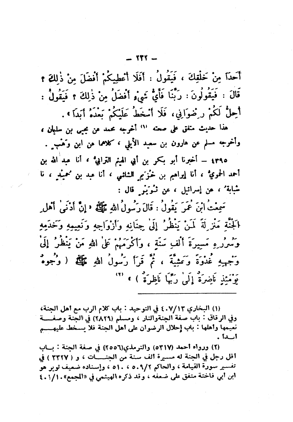 4395 - أَخْبَرَنَا أَبُو بَكْرِ بْنُ أَبِي الْهَيْثَمِ التُّرَابِيُّ، أَنَا عَبْدُ اللَّهِ بْنُ أَحْمَدَ الْحَمَوِيُّ، أَنَا إِبْرَاهِيمُ بْنُ خُزَيْمٍ الشَّاشِيُّ، أَنَا عَبْدُ بْنُ حُمَيْدٍ، نَا شَبَابَةُ، عَنْ إِسْرَائِيلَ، عَنْ ثُوَيْرٍ، قَالَ: سَمِعْتُ ابْنَ عُمَرَ، يَقُولُ: قَالَ رَسُولُ اللَّهِ صَلَّى اللهُ عَلَيْهِ وَسَلَّمَ: " إِنَّ أَدْنَى أَهْلِ الْجَنَّةِ مَنْزِلَةً لَمَنْ يَنْظُرُ إِلَى جِنَانِهِ، وَأَزْوَاجِهِ، وَنَعِيمِهِ، وَخَدَمِهِ، وَسُرُرِهِ مَسِيرَةَ أَلْفِ سَنَةٍ، وَأَكْرَمُهُمْ عَلَى اللَّهِ مَنْ يَنْظُرُ إِلَى وَجْهِهِ غَدْوَةً وَعَشِيَّةً، ثُمَّ قَرَأَ رَسُولُ اللَّهِ صَلَّى اللهُ عَلَيْهِ وَسَلَّمَ {وُجُوهٌ يَوْمَئِذٍ نَاضِرَةٌ {22} إِلَى رَبِّهَا نَاظِرَةٌ {23}} [الْقِيَامَة: 22 - 23] "
