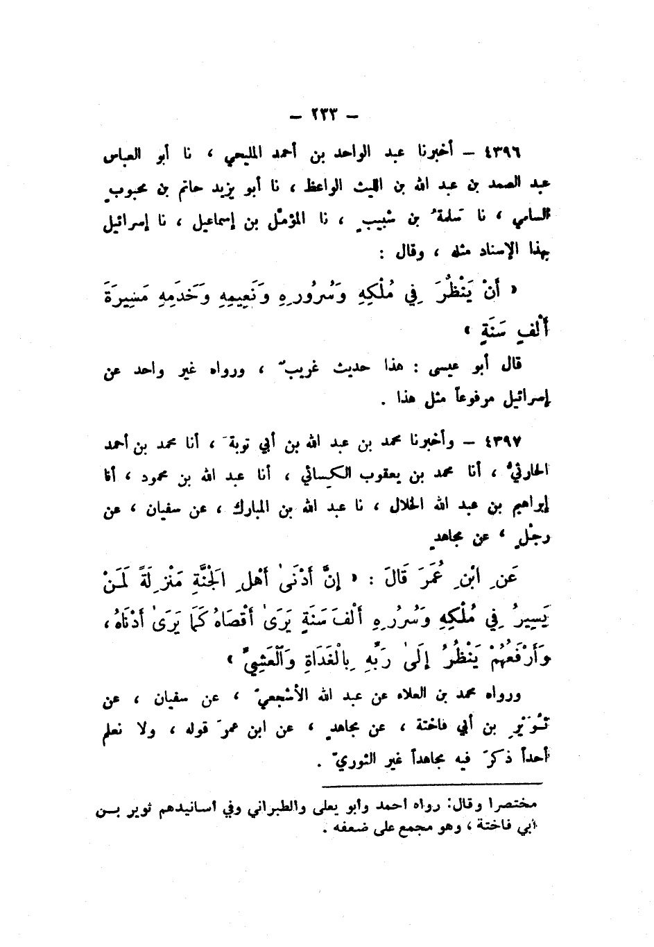 4396 - أَخْبَرَنَا عَبْدُ الْوَاحِدِ بْنُ أَحْمَدَ الْمَلِيحِيُّ، نَا أَبُو الْعَبَّاسِ عَبْدُ الصَّمَدِ بْنُ عَبْدِ اللَّهِ بْنِ اللَّيْثِ الْوَاعِظُ، نَا أَبُو يَزِيدَ حَاتِمُ بْنُ مَحْبُوبٍ السَّامِيُّ، نَا سَلَمَةُ بْنُ شَبِيبٍ، نَا الْمُؤَمَّلُ بْنُ إِسْمَاعِيلَ، نَا إِسْرَائِيلُ، بِهَذَا الإِسْنَادِ مِثْلَهُ، وَقَالَ: «أَنْ يَنْظُرَ فِي مُلْكِهِ، أَوْ سُرُورِهِ، وَنَعِيمِهِ، وَخَدَمِهِ مَسِيرَةَ أَلْفِ سَنَةٍ».