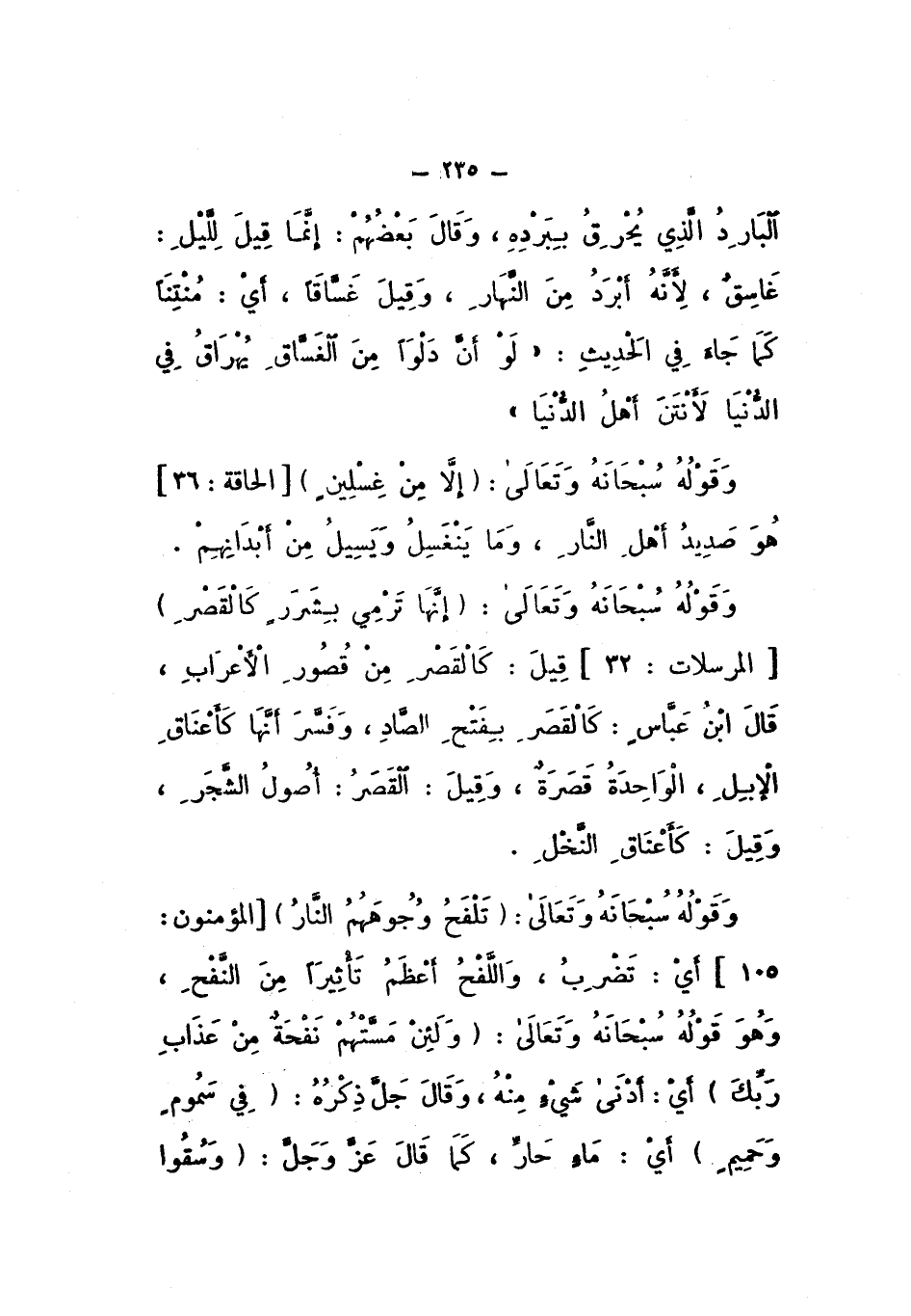 وَقَوله سُبْحَانَهُ وَتَعَالَى: {إِنَّهَا تَرْمِي بِشَرَرٍ كَالْقَصْرِ} [المرسلات: 32]، قِيلَ: كالقصر من قُصُور الْأَعْرَاب، قَالَ ابْنُ عَبَّاسٍ: كالقصر بِفَتْح الصَّاد، وَفسّر أَنَّهَا كأعناق الْإِبِل، الْوَاحِدَة قصرة، وَقِيلَ: الْقصر: أصُول الشّجر، وَقِيلَ: كأعناق النّخل.