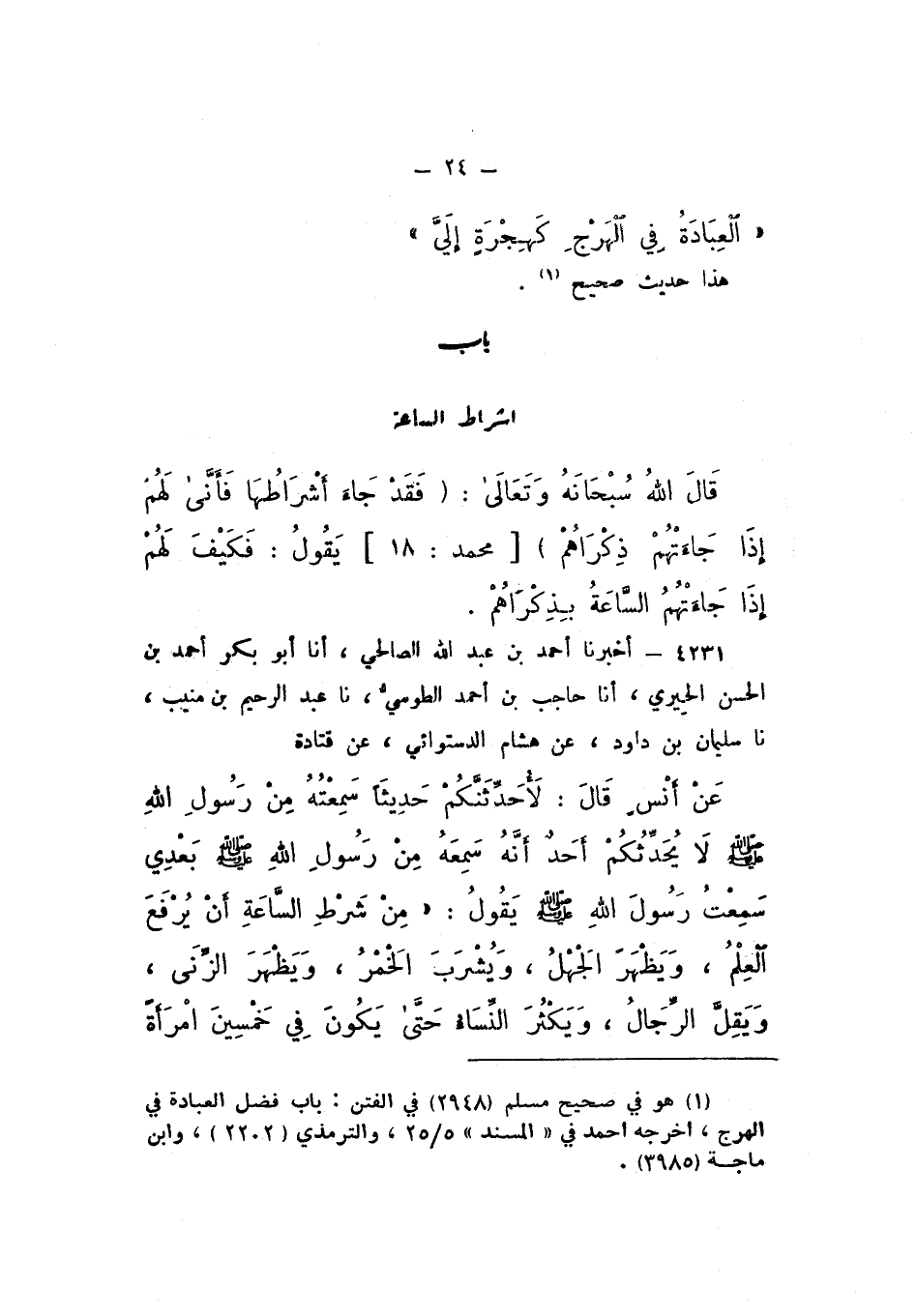 4231 - أَخْبَرَنَا أَحْمَدُ بْنُ عَبْدِ اللَّهِ الصَّالِحِيُّ، أَنَا أَبُو بَكْرٍ أَحْمَدُ بْنُ الْحَسَنِ الْحِيرِيُّ، أَنَا حَاجِبُ بْنُ أَحْمَدَ الطُّوسِيُّ، نَا عَبْدُ الرَّحِيمِ بْنُ مُنِيبٍ، نَا سُلَيْمَانُ بْنُ دَاوُدَ، عَنْ هِشَامٍ الدَّسْتُوَائِيِّ، عَنْ قَتَادَةَ، عَنْ أَنَسٍ، قَالَ: لأُحَدِّثَنَّكُمْ حَدِيثًا سَمِعْتُهُ مِنْ رَسُولِ اللَّهِ صَلَّى اللهُ عَلَيْهِ وَسَلَّمَ، لَا يُحَدِّثُكُمْ أَحَدٌ أَنَّهُ سَمِعَهُ مِنْ رَسُولِ اللَّهِ صَلَّى اللهُ عَلَيْهِ وَسَلَّمَ بَعْدِي، سَمِعْتُ رَسُولَ اللَّهِ صَلَّى اللهُ عَلَيْهِ وَسَلَّمَ يَقُولُ: «مِنْ شَرْطِ السَّاعَةِ أَنْ يُرْفَعَ الْعِلْمُ، وَيَظْهَرَ الْجَهْلُ، وَيُشْرَبَ الْخَمْرُ، وَيَظْهَرَ الزِّنَا، وَيَقِلَّ الرِّجَالُ، وَيَكْثُرَ النِّسَاءُ حَتَّى يَكُونَ فِي خَمْسِينَ امْرَأَةً