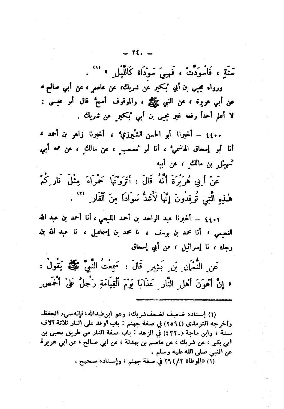 4400 - أَخْبَرَنَا أَبُو الْحَسَنِ الشِّيرَزِيُّ، أَخْبَرَنَا زَاهِرُ بْنُ أَحْمَدَ، أَنَا أَبُو إِسْحَاقَ الْهَاشِمِيُّ، أَنَا أَبُو مُصْعَبٍ، عَنْ مَالِكٍ، عَنْ عَمِّهِ أَبِي سُهَيْلِ بْنِ مَالِكٍ، عَنْ أَبِيهِ، عَنْ أَبِي هُرَيْرَةَ، أَنَّهُ قَالَ: «أَتَرَوْنَهَا حَمْرَاءَ مِثْلَ نَارِكُمْ هَذِهِ الَّتِي تُوقِدُونَ؟ إِنَّهَا لأَشَدُّ سَوَادًا مِنَ الْقَارِ».