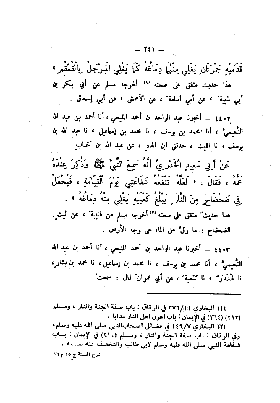 4402 - أَخْبَرَنَا عَبْدُ الْوَاحِدِ بْنُ أَحْمَدَ الْمَلِيحِيُّ، أَنَا أَحْمَدُ بْنُ عَبْدِ اللَّهِ النُّعَيْمِيُّ، أَنَا مُحَمَّدُ بْنُ يُوسُفَ، نَا مُحَمَّدُ بْنُ إِسْمَاعِيلَ، نَا عَبْدُ اللَّهِ بْنُ يُوسُفَ، نَا اللَّيْثُ، حَدَّثَنِي ابْنُ الْهَادِ، عَنْ عَبْدِ اللَّهِ بْنِ خَبَّابٍ، عَنْ أَبِي سَعِيدٍ الْخُدْرِيِّ، أَنَّهُ سَمِعَ النَّبِيَّ صَلَّى اللهُ عَلَيْهِ وَسَلَّمَ، وَذُكِرَ عِنْدَهُ عَمُّهُ، فَقَالَ: «لَعَلَّهُ تَنْفَعُهُ شَفَاعَتِي يَوْمَ الْقِيَامَةِ، فَيُجْعَلُ فِي ضَحْضَاحٍ مِنَ النَّارِ، يَبْلُغُ كَعْبَيْهِ يَغْلِي مِنْهُ دِمَاغُهُ».