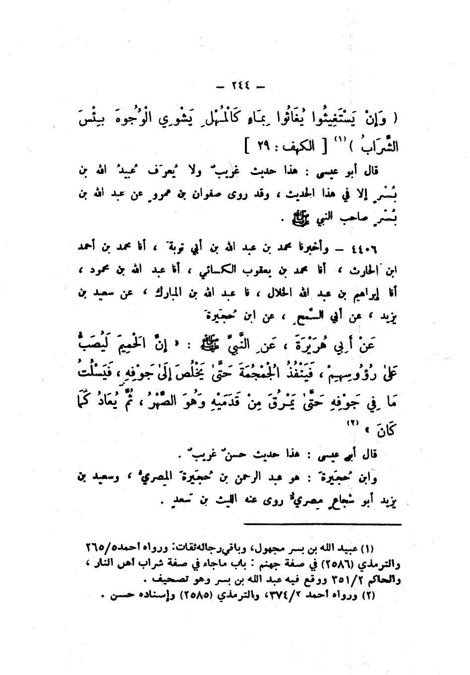 4406 - وَأَخْبَرَنَا مُحَمَّدُ بْنُ عَبْدِ اللَّهِ بْنِ أَبِي تَوْبَةَ، أَنَا مُحَمَّدُ بْنُ أَحْمَدَ بْنِ الْحَارِثِ، أَنا مُحَمَّدُ بْنُ يَعْقُوبَ الْكِسَائِيُّ، أَنَا عَبْدُ اللَّهِ بْنُ مَحْمُودٍ، أَنَا إِبْرَاهِيمُ بْنُ عَبْدِ اللَّهِ الْخَلالُ، نَا عَبْدُ اللَّهِ بْنُ الْمُبَارَكِ، عَنْ سَعِيدِ بْنِ يَزِيدَ، عَنْ أَبِي السَّمْحِ، عَنِ ابْنِ حُجَيْرَةَ، عَنْ أَبِي هُرَيْرَةَ، عَنِ النَّبِيِّ صَلَّى اللهُ عَلَيْهِ وَسَلَّمَ: «إِنَّ الْحَمِيمَ لَيُصَبُّ عَلَى رُءُوسِهِمْ، فَيَنْفُذُ الْجُمْجُمَةَ حَتَّى يَخْلُصَ إِلَى جَوْفِهِ، فيسلت مَا فِي جَوْفِهِ حَتَّى يَمْرُقَ مِنْ قَدَمَيْهِ، وَهُوَ الصَّهْرُ، ثُمَّ يُعَادُ كَمَا كَانَ».