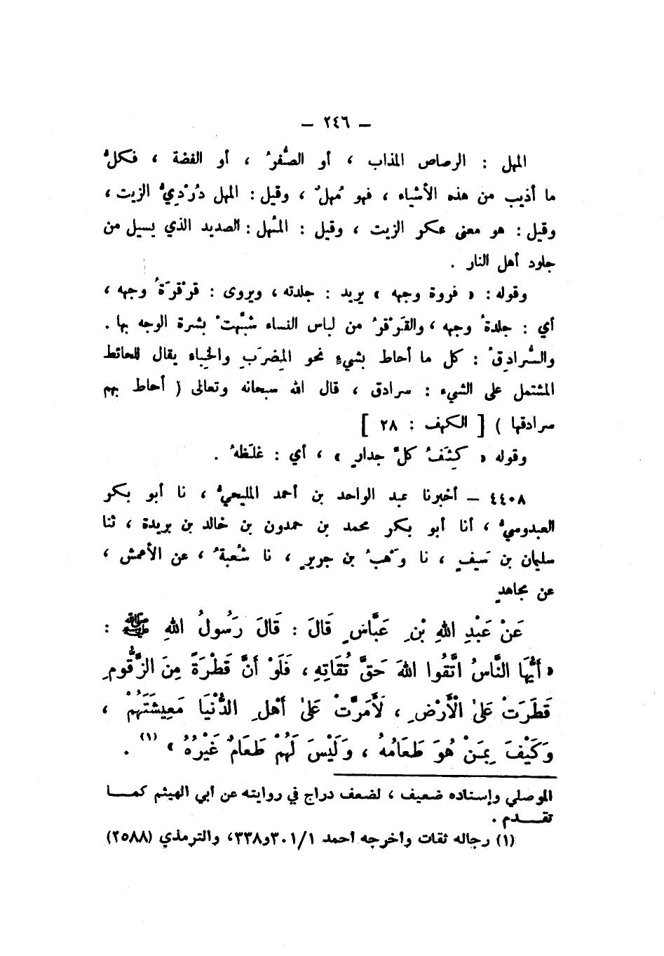 4408 - أَخْبَرَنَا عَبْدُ الْوَاحِدِ بْنُ أَحْمَدَ الْمَلِيحِيُّ، نَا أَبُو بَكْرٍ الْعُبْدُوسِيُّ، أَنَا أَبُو بَكْرٍ مُحَمَّدُ بْنُ حَمْدُونَ بْنِ خَالِد بْنِ بُرَيْدَةَ، ثَنَا سُلَيْمَانُ بْنُ سَيْفٍ، نَا وَهْبُ بْنُ جَرِيرٍ، نَا شُعْبَةُ، عَنِ الأَعْمَشِ، عَنْ مُجَاهِدٍ، عَنْ عَبْدِ اللَّهِ بْنِ عَبَّاس، قَالَ: قَالَ رَسُولُ اللَّهِ صَلَّى اللهُ عَلَيْهِ وَسَلَّمَ: «أَيُّهَا النَّاسُ، اتَّقُوا اللَّهَ حَقَّ تُقَاتِهِ، فَلَوْ أَنَّ قَطْرَةً مِنَ الزَّقُّومِ قَطَرَتْ عَلَى الأَرْضِ، لأمرت عَلَى أَهْلِ الدُّنْيَا مَعِيشَتَهُمْ، وَكَيْفَ بِمَنْ هُوَ طَعَامُهُ، وَلَيْسَ لَهُمْ طَعَامٌ غَيْرُهُ».