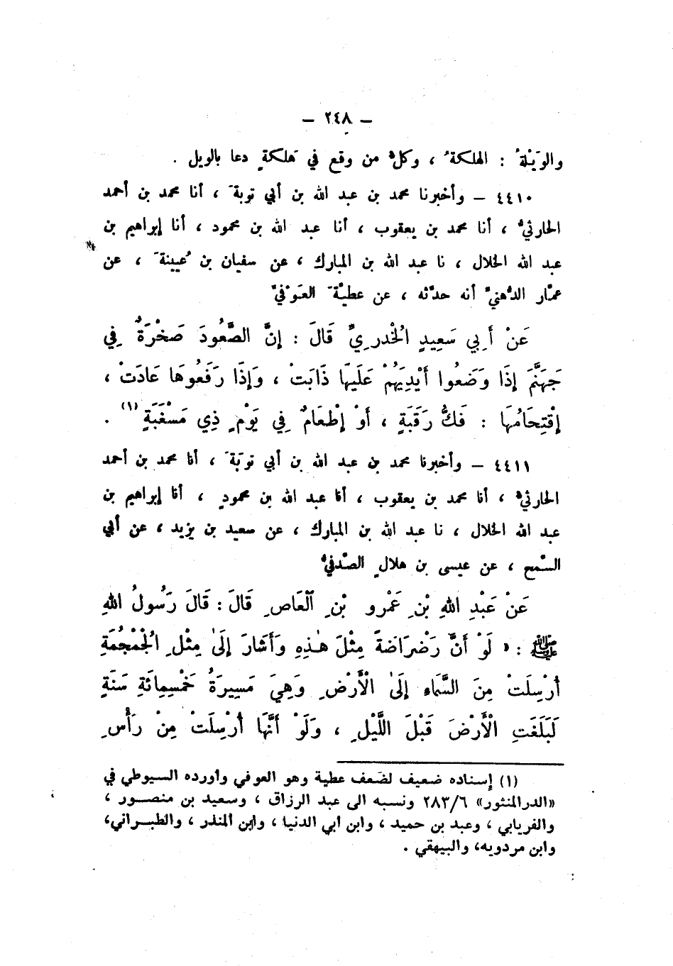 4410 - وَأَخْبَرَنَا مُحَمَّدُ بْنُ عَبْدِ اللَّهِ بْنِ أَبِي تَوْبَةَ، أَنَا مُحَمَّدُ بْنُ أَحْمَدَ الْحَارِثِيُّ، أَنَا مُحَمَّدُ بْنُ يَعْقُوبَ، أَنَا عَبْدُ اللَّهِ بْنُ مَحْمُودٍ، أَنَا إِبْرَاهِيمُ بْنُ عَبْدِ اللَّهِ الْخَلالُ، نَا عَبْدُ اللَّهِ بْنُ الْمُبَارَكِ، عَنْ سُفْيَانَ بْنِ عُيَيْنَةَ، عَنْ عَمَّارٍ الدُّهْنِيِّ أَنَّهُ حَدَّثَهُ، عَنْ عَطِيَّةَ الْعَوْفِيِّ، عَنْ أَبِي سَعِيدٍ الْخُدْرِيِّ، قَالَ: " إِنَّ الصَّعُودَ صَخْرَةٌ فِي جَهَنَّمَ إِذَا وَضَعُوا أَيْدِيَهُمْ عَلَيْهَا ذَابَتْ، وَإِذَا رَفَعُوهَا عَادَتْ، اقْتِحَامُهَا: {فَكُّ رَقَبَةٍ {13} أَوْ إِطْعَامٌ فِي يَوْمٍ ذِي مَسْغَبَةٍ {14}} [الْبَلَد: 13 - 14] "