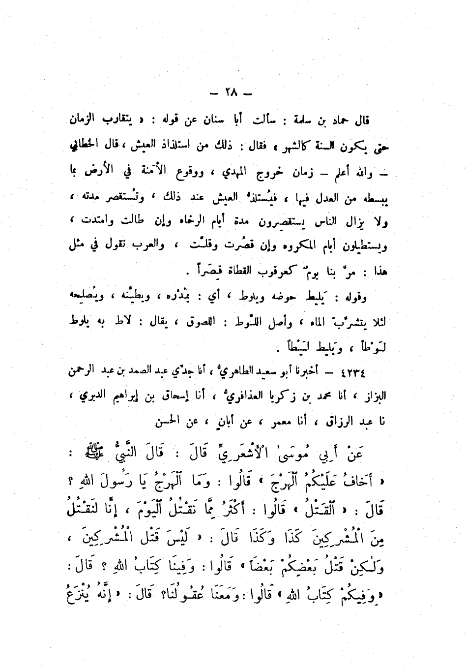 4234 - أَخْبَرَنَا أَبُو سَعِيدٍ الطَّاهِرِيُّ، أَنَا جَدِّي عَبْدُ الصَّمَدِ بْنُ عَبْدِ الرَّحْمَنِ الْبَزَّازُ , أَنَا مُحَمَّدُ بْنُ زَكَرِيَّا الْعُذَافِرِيُّ، أَنَا إِسْحَاقُ بْنُ إِبْرَاهِيمَ الدَّبَرِيُّ، نَا عَبْدُ الرَّزَّاقِ، أَنَا مَعْمَرٌ، عَنْ أَبَانٍ، عَنِ الْحَسَنِ، عَنْ أَبِي مُوسَى الأَشْعَرِيِّ، قَالَ: قَالَ النَّبِيُّ صَلَّى اللهُ عَلَيْهِ وَسَلَّمَ: «أَخَافُ عَلَيْكُمُ الْهَرْجُ»، قَالُوا: وَمَا الْهَرْجُ يَا رَسُولَ اللَّهِ؟ قَالَ: «الْقَتْلُ»، قَالُوا: أَكْثَرُ مِمَّا نَقْتُلُ الْيَوْمَ، إِنَّا لَنَقْتُلُ مِنَ الْمُشْرِكِينَ كَذَا وَكَذَا، قَالَ: «لَيْسَ قَتْلُ الْمُشْرِكِينَ، وَلَكِنْ قَتْلُ بَعْضِكُمْ بَعْضًا»، قَالُوا: وَفِينَا كِتَابُ اللَّهِ؟ قَالَ: «وَفِيكُمْ كِتَابُ اللَّهِ»، قَالُوا: وَمَعَنَا عُقُولُنَا؟ قَالَ: «إِنَّهُ يُنْزَعُ