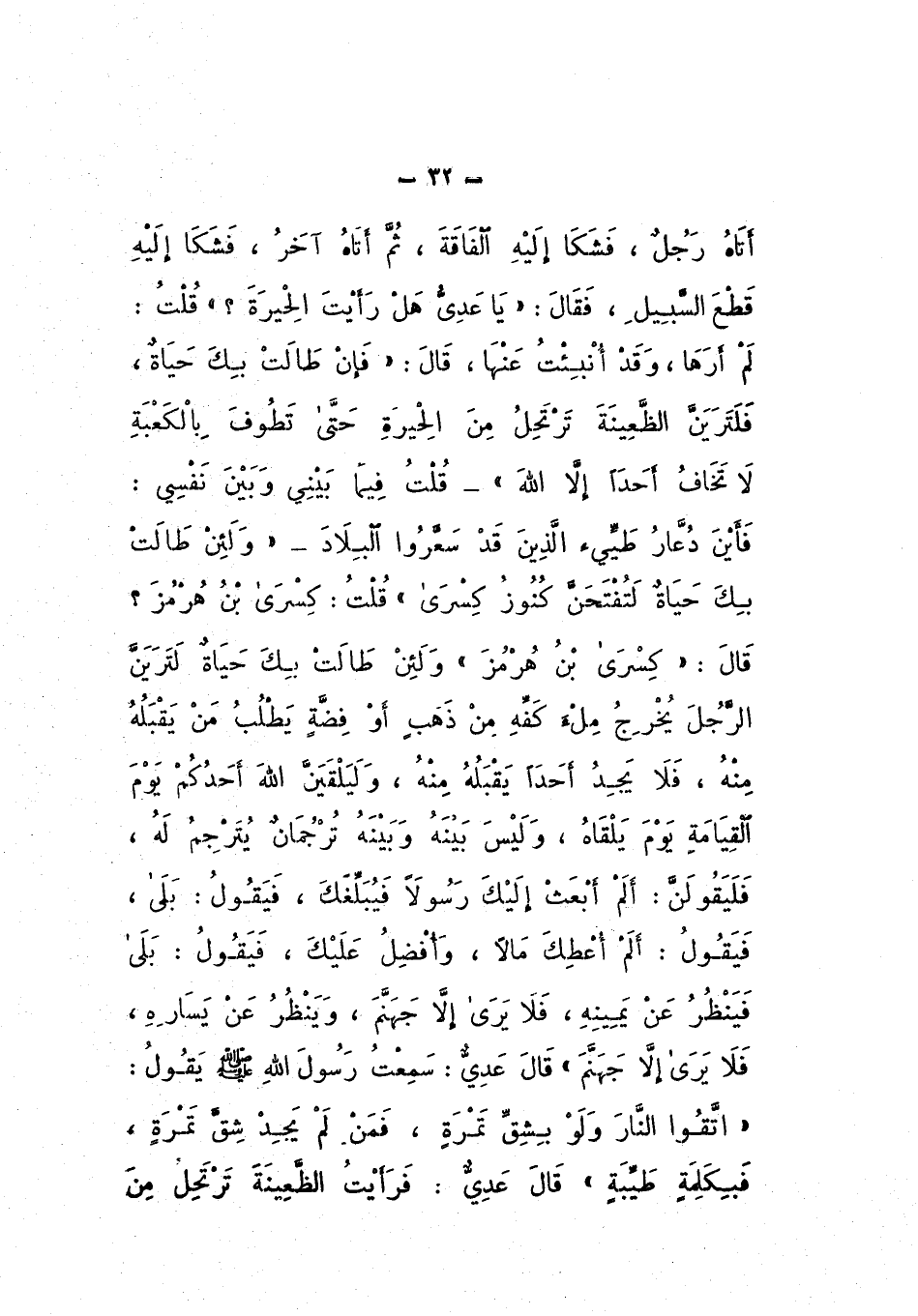 أَتَاهُ رَجُلٌ، فَشَكَا إِلَيْهِ الْفَاقَةَ، ثُمَّ أَتَاهُ آخَرُ، فَشَكَا إِلَيْهِ قَطْعَ السَّبِيلِ، فَقَالَ: «يَا عَدِيُّ، هَلْ رَأَيْتَ الْحِيرَةَ؟» قُلْتُ: لَمْ أَرَهَا، وَقَدْ أُنْبِئْتُ عَنْهَا، قَالَ: «فَإِنْ طَالَتْ بِكَ حَيَاةٌ، فَلَتَرَيَنَّ الظَّعِينَةَ تَرْتَحِلُ مِنَ الْحِيرَةِ حَتَّى تَطُوفَ بِالْكَعْبَةِ لَا تَخَافُ أَحَدًا إِلا اللَّهُ»، قُلْتُ فِيمَا بَيْنِي وَبَيْنَ نَفْسِي: فَأَيْنَ دُعَّارُ طَيِّئٍ الَّذِينَ قَدْ سَعَّرُوا الْبِلادَ، «وَلَئِنْ طَالَتْ بِكَ حَيَاةٌ، لَتُفْتَحَنَّ كُنُوزَ كِسْرَى»، قُلْتُ: كِسْرَى بْنُ هُرْمُزَ؟ قَالَ: " كِسْرَى بْنُ هُرْمُزَ، وَلَئِنْ طَالَتْ بِكَ حَيَاةٌ لَتَرَيَنَّ الرَّجُلَ يُخْرِجُ مِلْءَ كَفِّهِ مِنْ ذَهَبٍ، أَوْ فِضَّةٍ، يَطْلُبُ مَنْ يَقْبَلُهُ مِنْهُ، فَلا يَجِدُ أَحَدًا يَقْبَلُهُ مِنْهُ، وَلَيَلْقَيَنَّ اللَّهُ أَحَدَكُمْ يَوْمَ الْقِيَامَةِ يَوْمَ يَلْقَاهُ، وَلَيْسَ بَيْنَهُ وَبَيْنَهُ تُرجمان يُتَرْجِمُ لَهُ، فَلَيَقُولَنَّ: أَلَمْ أَبْعَثْ إِلَيْكَ رَسُولا فَيُبْلِغُكَ؟ فَيَقُولُ: بَلَى، فَيَقُولُ: أَلَمْ أُعْطِكَ مَالا، وَأُفْضِلْ عَلَيْكَ؟ فَيَقُولُ: بَلَى، فَيَنْظُرُ عَنْ يَمِينِهِ، فَلا يَرَى إِلا جَهَنَّمَ، وَيَنْظُرُ عَنْ يَسَارِهِ، فَلا يَرَى إِلا جَهَنَّمَ "، قَالَ عَدِيٌّ: سَمِعْتُ رَسُولَ اللَّهِ صَلَّى اللهُ عَلَيْهِ وَسَلَّمَ يَقُولُ: «اتَّقُوا النَّارُ وَلَوْ بِشِقِّ تَمْرَةٍ، فَمَنْ لَمْ يَجِدْ شِقَّ تَمْرَةٍ، فَبِكَلِمَةٍ طَيِّبَةٍ»، قَالَ عَدِيٌّ: فَرَأَيْتُ الظَّعِينَةَ تَرْتَحِلُ مِنَ