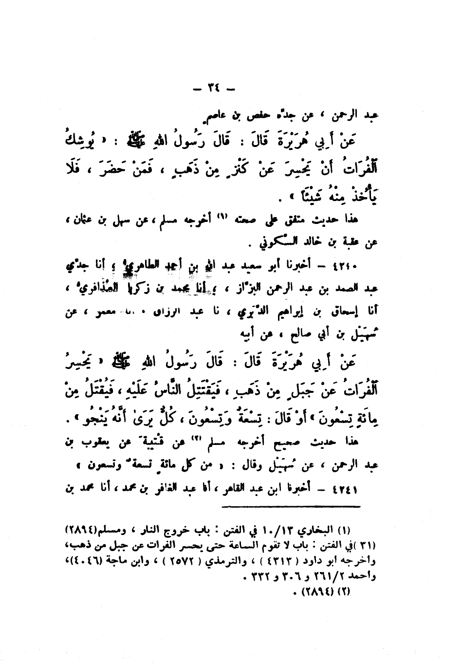 4240 - أَخْبَرَنَا أَبُو سَعِيدٍ عَبْدُ اللَّهِ بْنُ أَحْمَدَ الطَّاهِرِيُّ، أَنَا جَدِّي عَبْدُ الصَّمَدِ بْنُ عَبْدِ الرَّحْمَنِ الْبَزَّازُ، أَنَا مُحَمَّدُ بْنُ زَكَرِيَّا الْعُذَافِرِيُّ، أَنَا إِسْحَاقُ بْنُ إِبْرَاهِيمَ الدَّبَرِيُّ، نَا عَبْدُ الرَّزَّاقِ، أَنَا مَعْمَرٌ، عَنْ سُهَيْلِ بْنِ أَبِي صَالِحٍ، عَنْ أَبِيهِ، عَنْ أَبِي هُرَيْرَةَ، قَالَ: قَالَ رَسُولُ اللَّهِ صَلَّى اللهُ عَلَيْهِ وَسَلَّمَ: «يَحْسِرُ الْفُرَاتُ عَنْ جَبَلٍ مِنْ ذَهَبٍ، فَيَقْتَتِلُ النَّاسُ عَلَيْهِ، فَيُقْتَلُ مِنْ مِائَةٍ تِسْعُونَ»، أَوْ قَالَ: «تِسْعَةٌ وَتِسْعُونَ، كُلٌّ يَرَى أَنَّهُ يَنْجُو».