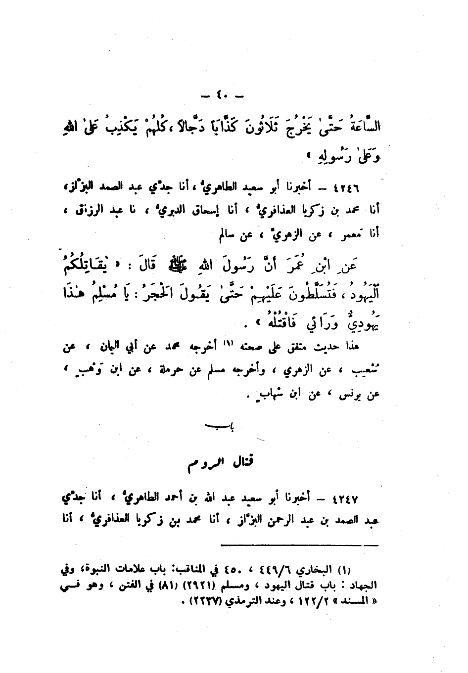 4246 - أَخْبَرَنَا أَبُو سَعِيدٍ الطَّاهِرِيُّ، أَنَا جَدِّي عَبْدُ الصَّمَدِ الْبَزَّازُ، أَنَا مُحَمَّدُ بْنُ زَكَرِيَّا الْعُذَافِرِيُّ، أَنَا إِسْحَاقُ الدَّبَرِيُّ، نَا عَبْدُ الرَّزَّاقِ، أَنَا مَعْمَرٌ، عَنِ الزُّهْرِيِّ، عَنْ سَالِمٍ، عَنِ ابْنِ عُمَرَ، أَنّ رَسُولَ اللَّهِ صَلَّى اللهُ عَلَيْهِ وَسَلَّمَ، قَالَ: " يُقَاتِلُكُمُ الْيَهُودُ، فَتُسَلَّطُونَ عَلَيْهِمْ حَتَّى يَقُولَ الْحَجَرُ: يَا مُسْلِمُ، هَذَا يَهُودِيُّ وَرَائِي، فَاقْتُلْهُ ".