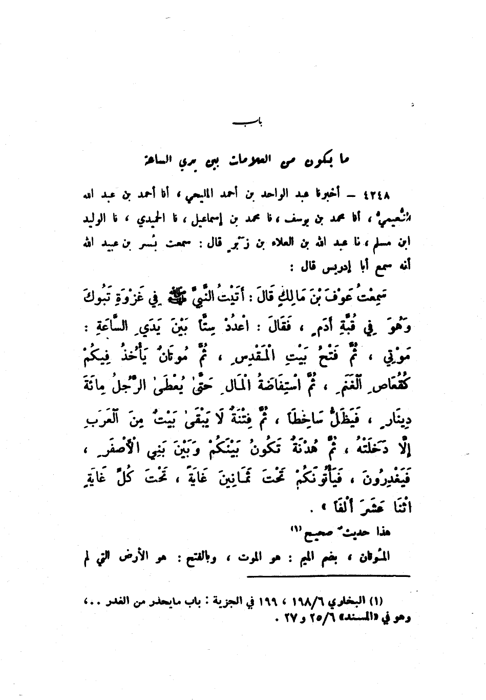 4248 - أَخْبَرَنَا عَبْدُ الْوَاحِدِ بْنُ أَحْمَدَ الْمَلِيحِيُّ، أَنَا أَحْمَدُ بْنُ عَبْدِ اللَّهِ النُّعَيْمِيُّ، أَنَا مُحَمَّدُ بْنُ يُوسُفَ، نَا مُحَمَّدُ بْنُ إِسْمَاعِيلَ، نَا الْحُمَيْدِيُّ، نَا الْوَلِيدُ بْنُ مُسْلِمٍ، نَا عَبْدُ اللَّهِ بْنُ الْعَلاءِ بْنِ زَبْرٍ، قَالَ: سَمِعْتُ بُسْرَ بْنَ عُبَيْدِ اللَّهِ، أَنَّهُ سَمِعَ أَبَا إِدْرِيسَ، قَالَ: سَمِعْتُ عَوْفَ بْنَ مَالِكٍ، قَالَ: أَتَيْتُ النَّبِيَّ صَلَّى اللهُ عَلَيْهِ وَسَلَّمَ فِي غَزْوَةِ تَبُوكَ وَهُوَ فِي قُبَّةِ أَدَمٍ، فَقَالَ: " اعْدُدْ سِتًّا بَيْنَ يَدَيِ السَّاعَةِ: مَوْتِي، ثُمَّ فَتْحُ بَيْتِ الْمَقْدِسِ، ثُمَّ مُوتَانٌ يَأْخُذُ فِيكُمْ كَقُعَاصِ الْغَنَمِ، ثُمَّ اسْتِفَاضَةُ الْمَالِ حَتَّى يُعْطَى الرَّجُلُ مِائَةَ دِينَارٍ، فَيَظَلُّ سَاخِطًا، ثُمَّ فِتْنَةٌ لَا يَبْقَى بَيْتٌ مِنَ الْعَرَبِ إِلا دَخَلَتْهُ، ثُمَّ هُدْنَةٌ تَكُونُ بَيْنَكُمْ وَبَيْنَ بَنِي الأَصْفَرِ، فَيَغْدِرُونَ، فَيَأْتُونَكُمْ تَحْتَ ثَمَانِينَ غَايَةً، تَحْتَ كُلِّ غَايَةٍ اثْنَا عَشَرَ أَلْفًا ".