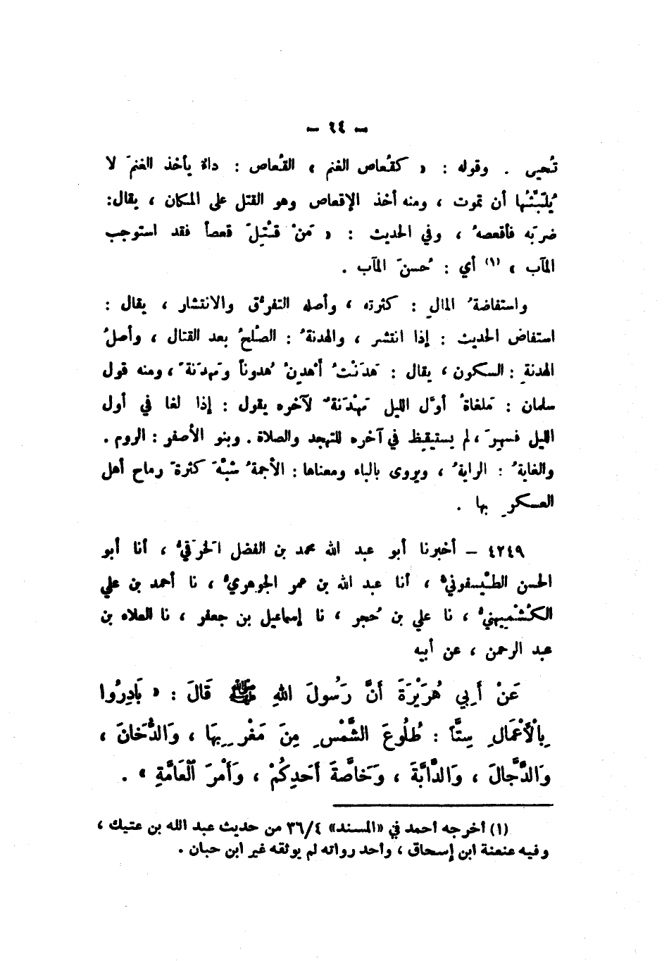 4249 - أَخْبَرَنَا أَبُو عَبْدِ اللَّهِ مُحَمَّدُ بْنُ الْفَضْلِ الْخِرَقِيُّ , أَنا أَبُو الْحَسَنِ الطَّيْسَفُونِيُّ، أَنَا عَبْدُ اللَّهِ بْنُ عُمَرَ الْجَوْهَرِيُّ، نَا أَحْمَدُ بْنُ عَلِيٍّ الْكُشْمِيهَنِيُّ، نَا عَلِيُّ بْنُ حُجْرٍ، نَا إِسْمَاعِيلُ بْنُ جَعْفَرٍ، نَا الْعَلاءُ بْنُ عَبْدِ الرَّحْمَنِ، عَنْ أَبِيهِ، عَنْ أَبِي هُرَيْرَةَ، أَنّ رَسُولَ اللَّهِ صَلَّى اللهُ عَلَيْهِ وَسَلَّمَ، قَالَ: " بَادِرُوا بِالأَعْمَالِ سِتًّا: طُلُوعَ الشَّمْسِ مِنْ مَغْرِبِهَا، وَالدُّخَانَ، وَالدَّجَّالَ، وَالدَّابَّةَ، وَخَاصَّةَ أَحَدِكُمْ، وَأَمْرَ الْعَامَّةِ ".