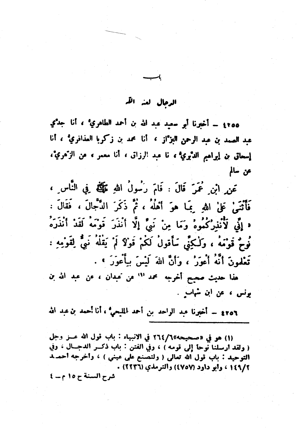 4255 - أَخْبَرَنَا أَبُو سَعِيدٍ عَبْدُ اللَّهِ بْنُ أَحْمَدَ الطَّاهِرِيُّ، أَنَا جَدِّي عَبْدُ الصَّمَدِ بْنُ عَبْدِ الرَّحْمَنِ الْبَزَّازُ، أَنَا مُحَمَّدُ بْنُ زَكَرِيَّا الْعُذَافِرِيُّ، أَنَا إِسْحَاقُ بْنُ إِبْرَاهِيمَ الدَّبَرِيُّ، نَا عَبْدُ الرَّزَّاقِ، أَنَا مَعْمَرٌ، عَنِ الزُّهْرِيِّ، عَنْ سَالِمٍ، عَنِ ابْنِ عُمَرَ، قَالَ: قَامَ رَسُولُ اللَّهِ صَلَّى اللهُ عَلَيْهِ وَسَلَّمَ فِي النَّاسِ، فَأَثْنَى عَلَى اللَّهِ بِمَا هُوَ أَهْلُهُ، ثُمَّ ذَكَرَ الدَّجَّالَ، فَقَالَ: " إِنِّي لأُنْذِرُكُمُوهُ، وَمَا مِنْ نَبِيٍّ إِلا أَنْذَرَ قَوْمَهُ، لَقَدْ أَنْذَرَهُ نُوحٌ قَوْمَهُ، وَلَكِنِّي سَأَقُولُ لَكُمْ قَوْلا لَمْ يَقُلْهُ نَبِيٌّ لِقَوْمِهِ: تَعْلَمُونَ أَنَّهُ أَعْوَرُ، وَأَنَّ اللَّهَ لَيْسَ بِأَعْوَرَ ".