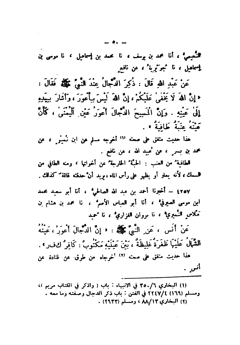 النُّعَيْمِيُّ، أَنَا مُحَمَّدُ بْنُ يُوسُفَ، نَا مُحَمَّدُ بْنُ إِسْمَاعِيلَ، نَا مُوسَى بْنُ إِسْمَاعِيلَ، نَا جُوَيْرِيَةُ، عَنْ نَافِعٍ، عَنْ عَبْدِ اللَّهِ، قَالَ: ذُكِرَ الدَّجَّالُ عِنْدَ النَّبِيِّ صَلَّى اللهُ عَلَيْهِ وَسَلَّمَ، فَقَالَ: «إِنَّ اللَّهَ لَا يَخْفَى عَلَيْكُمْ، إِنَّ اللَّهَ لَيْسَ بِأَعْوَرَ، وَأَشَارَ بِيَدِهِ إِلَى عَيْنِهِ.