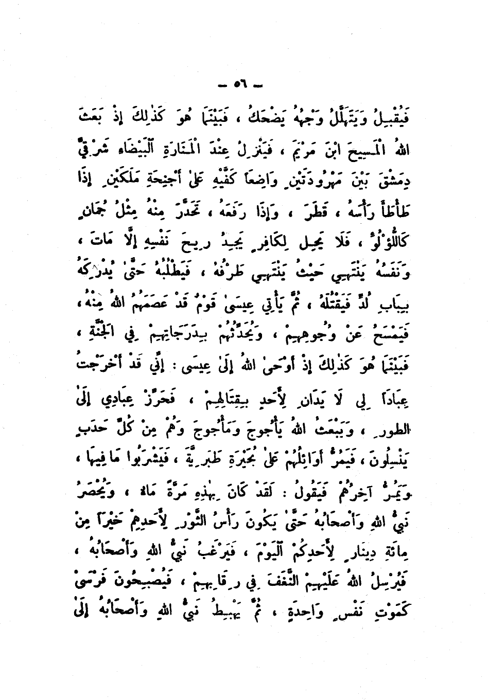 فَيُقْبِلُ وَيَتَهَلَّلُ وَجْهُهُ يَضْحَكُ، فَبَيْنَمَا هُوَ كَذَلِكَ إِذْ بَعَثَ اللَّهُ الْمَسِيحَ ابْنَ مَرْيَمَ، فَيَنْزِلُ عِنْدَ الْمَنَارَةِ الْبَيْضَاءِ شَرْقِيَّ دِمَشْقَ بَيْنَ مَهْرُودَتَيْنِ وَاضِعًا كَفَّيْهِ عَلَى أَجْنِحَةِ مَلَكَيْنِ إِذَا طَأْطَأَ رَأْسَهُ قَطَرَ، وَإِذَا رَفَعَهُ، تَحَدَّرَ مِنْهُ مِثْلُ جُمَانٍ كَاللُّؤْلُؤِ، فَلا يَحِلُّ لِكَافِرٍ يَجِدُ رِيحَ نَفَسِهِ إِلا مَاتَ، وَنَفَسُهُ يَنْتَهِي حَيْثُ يَنْتَهِي طَرَفُهُ، فَيَطْلُبُهُ حَتَّى يُدْرِكَهُ بِبَابِ لُدٍّ فَيَقْتُلَهُ، ثُمَّ يَأْتِي عِيسَى قَوْمٌ قَدْ عَصَمَهُمُ اللَّهُ مِنْهُ، فَيَمْسَحُ عَنْ وُجُوهِهِمْ، وَيُحَدِّثُهُمْ بِدَرَجَاتِهِمْ فِي الْجَنَّةِ، فَبَيْنَمَا هُوَ كَذَلِكَ إِذْ أَوْحَى اللَّهُ إِلَى عِيسَى، إِنِّي قَدْ أَخْرَجْتُ عِبَادًا لِي لَا يَدَانِ لأَحَدٍ بِقِتَالِهِمْ، فَحَرِّزْ عِبَادِي إِلَى الطُّورِ، وَيَبْعَثُ اللَّهُ يَأْجُوجَ وَمَأْجُوجَ وَهُمْ مِنْ كُلِّ حَدَبٍ يَنْسِلُونَ، فَيَمُرُّ أَوَائِلُهُمْ عَلَى بُحَيْرَةِ طَبَرِيَّةَ، فَيَشْرَبُوا مَا فِيهَا، وَيَمُرُّ آخِرُهُمْ، فَيَقُولُ: لَقَدْ كَانَ بِهَذِهِ مَرَّةً مَاءٌ، ويحصر نَبِيُّ اللَّهِ وَأَصْحَابُهُ حَتَّى يَكُونَ رَأْسُ الثَّوْرِ لأَحَدِهِمْ خَيْرًا مِنْ مِائَةِ دِينَارٍ لأَحَدِكُمُ الْيَوْمَ، فَيَرْغَبُ نَبِيُّ اللَّهِ وَأَصْحَابُهُ، فَيُرْسِلُ اللَّهُ عَلَيْهِمُ النَّغَفَ فِي رِقَابِهِمْ، فَيُصْبِحُونَ فَرْسَى كَمَوْتِ نَفْسٍ وَاحِدَةٍ، ثُمَّ يَهْبِطُ نَبِيُّ اللَّهِ وَأَصْحَابُهُ إِلَى