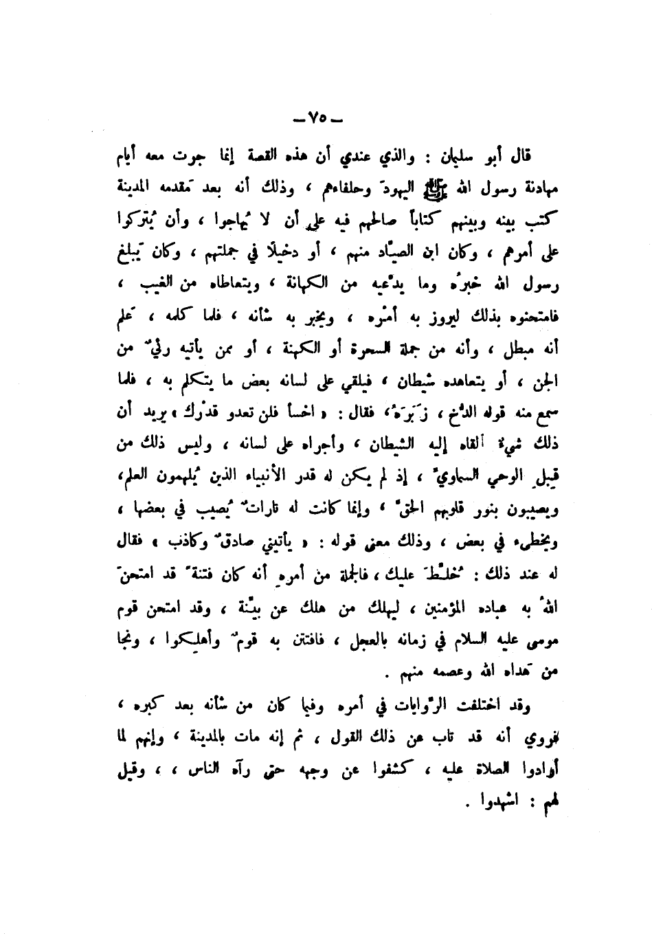 قَالَ أَبُو سُلَيْمَانَ: وَالَّذِي عِنْدِي أَن هَذِهِ الْقِصَّة إِنَّمَا جرت مَعَهُ أَيَّام مهادنة رَسُول اللَّهِ صَلَّى اللهُ عَلَيْهِ وَسَلَّمَ الْيَهُود وحلفاءهم، وَذَلِكَ أَنَّهُ بَعْد مقدمه الْمَدِينَة كتب بَينه وَبينهمْ كتابا صَالحهمْ فِيهِ عَلَى أَن لَا يهاجوا، وَأَن يتْركُوا عَلَى أَمرهم، وَكَانَ ابْن الصياد مِنْهُمْ، أَوْ دخيلا فِي جُمْلَتهمْ، وَكَانَ يبلغ رَسُول اللَّهِ خَبره وَمَا يَدعِيهِ من الكهانة، ويتعاطاه من الْغَيْب، فامتحنوه بِذَلِكَ ليروز بِهِ أمره، ويخبر بِهِ شَأْنه، فَلَمَّا كَلمه، علم أَنَّهُ مُبْطل، وَأَنه من جملَة السَّحَرَة أَوِ الكهنة، أَو مِمَّن يَأْتِيهِ رَئِيٌ من الْجِنّ، أَوْ يتعاهده شَيْطَان، فيلقي عَلَى لِسَانه بَعْض مَا يتَكَلَّم بِهِ، فَلَمَّا سمع مِنْهُ قَوْله الدخ، زبره، فَقَالَ: «اخْسَأْ فَلَنْ تعدو قدرك»، يُرِيد أَن ذَلِكَ شَيْء أَلْقَاهُ إِلَيْهِ الشَّيْطَان، وأجراه عَلَى لِسَانه، وَلَيْسَ ذَلِكَ من قبل الْوَحْي السماوي، إِذَ لَمْ يكن لَهُ قدر الْأَنْبِيَاء الَّذِينَ يُلْهمُون الْعلم، ويصيبون بِنور قُلُوبهم الْحق، وَإِنَّمَا كَانَتْ لَهُ تارات يُصِيب فِي بَعْضهَا، ويخطئ فِي بَعْض، وَذَلِكَ معنى قَوْله: «يأتيني صَادِق وكاذب»، فَقَالَ لَهُ عِنْدَ ذَلِكَ: خلط عَلَيْك، فالجملة من أمره أَنَّهُ كَانَ فتْنَة قَدِ امتحن اللَّه بِهِ عباده الْمُؤْمِنِينَ، ليهلك من هلك عَنْ بَيِّنَة، وَقَدِ امتحن قوم مُوسَى عَلَيْهِ السَّلامُ فِي زَمَانه بالعجل، فَافْتتنَ بِهِ قوم وأهلكوا، وَنَجَا من هداه اللَّه وَعَصَمَهُ مِنْهُمْ.