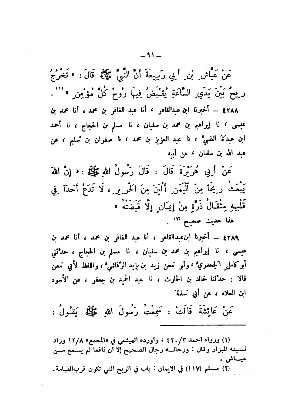 4288 - أَخْبَرَنَا ابْنُ عَبْدِ الْقَاهِرِ، أَنَا عَبْدُ الْغَافِرِ بْنُ مُحَمَّدٍ، أَنَا مُحَمَّدُ بْنُ عِيسَى، نَا إِبْرَاهِيمُ بْنُ مُحَمَّدِ بْنِ سُفْيَانَ، نَا مُسْلِمُ بْنُ الْحَجَّاجِ، نَا أَحْمَدُ بْنُ عَبْدَةَ الضَّبِّيُّ، نَا عَبْدُ الْعَزِيزِ بْنُ مُحَمَّدٍ، نَا صَفْوَانُ بْنُ سُلَيْمٍ، عَنْ عَبْدِ اللَّهِ بْنِ سَلْمَانَ، عَنْ أَبِيهِ، عَنْ أَبِي هُرَيْرَةَ، قَالَ: قَالَ رَسُولُ اللَّهِ صَلَّى اللهُ عَلَيْهِ وَسَلَّمَ: «إِنَّ اللَّهَ يَبْعَثُ رِيحًا مِنَ الْيَمَنِ أَلْيَنَ مِنَ الْحَرِيرِ، لَا تَدَعُ أَحَدًا فِي قَلْبِهِ مِثْقَالُ ذَرَّةٍ مِنْ إِيمَانٍ إِلا قَبَضَتْهُ».