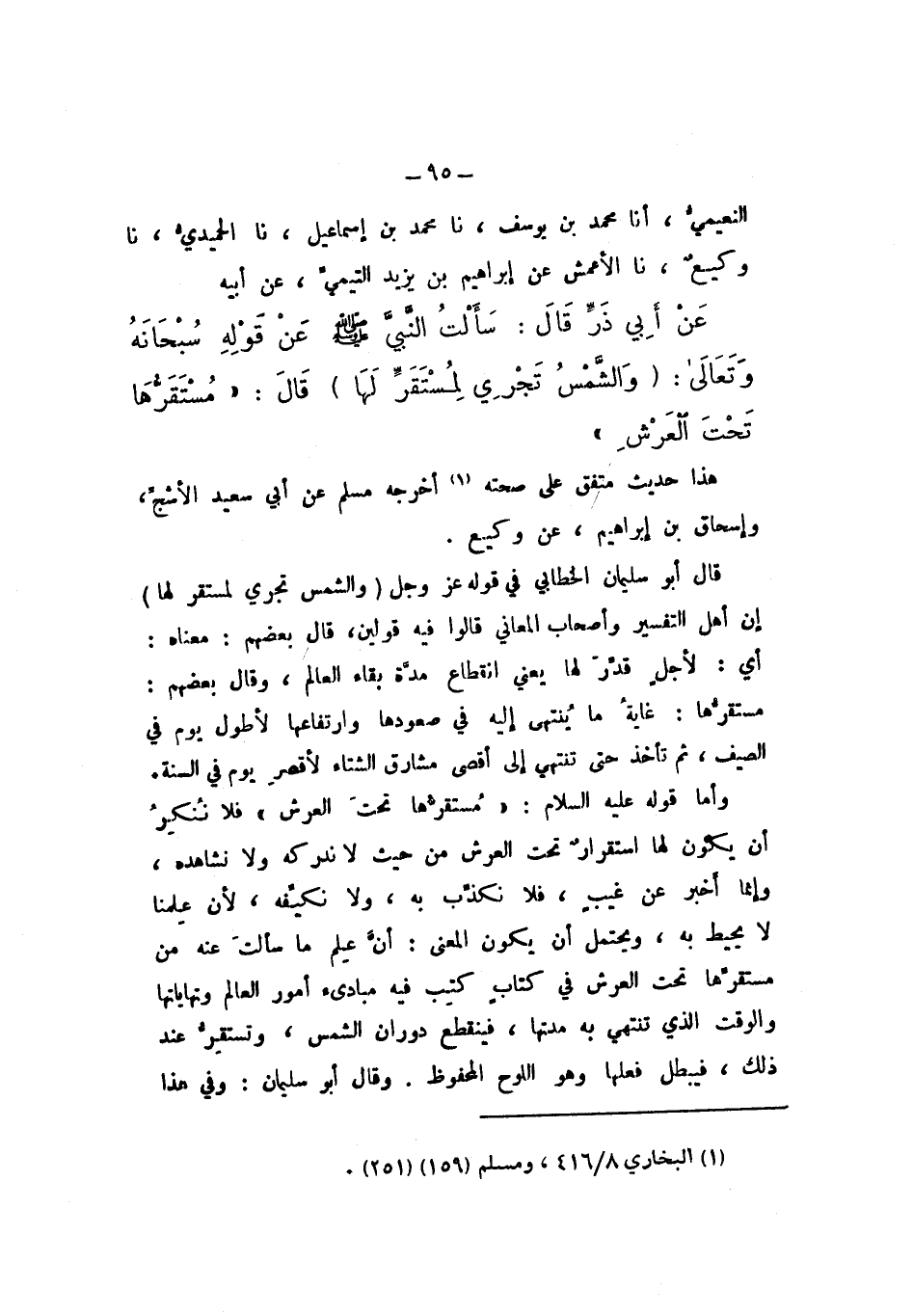 النُّعَيْمِيُّ، أَنَا مُحَمَّدُ بْنُ يُوسُفَ، نَا مُحَمَّدُ بْنُ إِسْمَاعِيلَ، نَا الْحُمَيْدِيُّ، نَا وَكِيعٌ، نَا الأَعْمَشُ، عَنْ إِبْرَاهِيمَ بْنِ يَزِيدَ التَّيْمِيِّ، عَنْ أَبِيهِ، عَنْ أَبِي ذَرٍّ، قَالَ: سَأَلْتُ النَّبِيَّ صَلَّى اللهُ عَلَيْهِ وَسَلَّمَ عَنْ قَوْلِهِ سُبْحَانَهُ وَتَعَالَى: {وَالشَّمْسُ تَجْرِي لِمُسْتَقَرٍّ لَهَا} [يس: 38]، قَالَ: «مُسْتَقَرُّهَا تَحْتَ الْعَرْشِ».