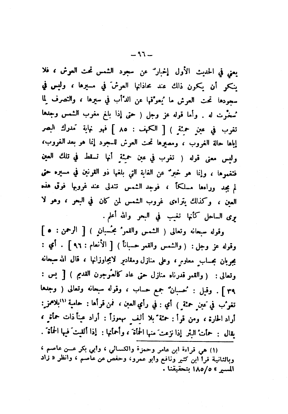 وَأَمَّا قَوْله عَزَّ وَجَلَّ: {حَتَّى إِذَا بَلَغَ مَغْرِبَ الشَّمْسِ وَجَدَهَا تَغْرُبُ فِي عَيْنٍ حَمِئَةٍ} [الْكَهْف: 86]، فَهُوَ نِهَايَة مدرك الْبَصَر إِيَّاهَا حَالَة الْغُرُوب، ومصيرها تَحْتَ الْعَرْش للسُّجُود إِنَّمَا هُوَ بَعْد الْغُرُوب، وَلَيْسَ معنى قَوْله: {تَغْرُبُ فِي عَيْنٍ حَمِئَةٍ} [الْكَهْف: 86]، أَنَّهَا تسْقط فِي تِلْكَ الْعين فتغمرها، وَإِنَّمَا هُوَ خبر عَنِ الْغَايَة الَّتِي بلغَهَا ذُو القرنين فِي مسيره حَتَّى لَمْ يجد وَرَاءَهَا مسلكا، فَوجدَ الشَّمْس تتدلى عِنْدَ غُرُوبهَا فَوْقَ هَذِهِ الْعين، وَكَذَلِكَ يتَرَاءَى غرُوب الشَّمْس لمن كَانَ فِي الْبَحْر، وَهُوَ لَا يرى السَّاحِل كَأَنَّهَا تغيب فِي الْبَحْر، وَاللَّه أعلم.