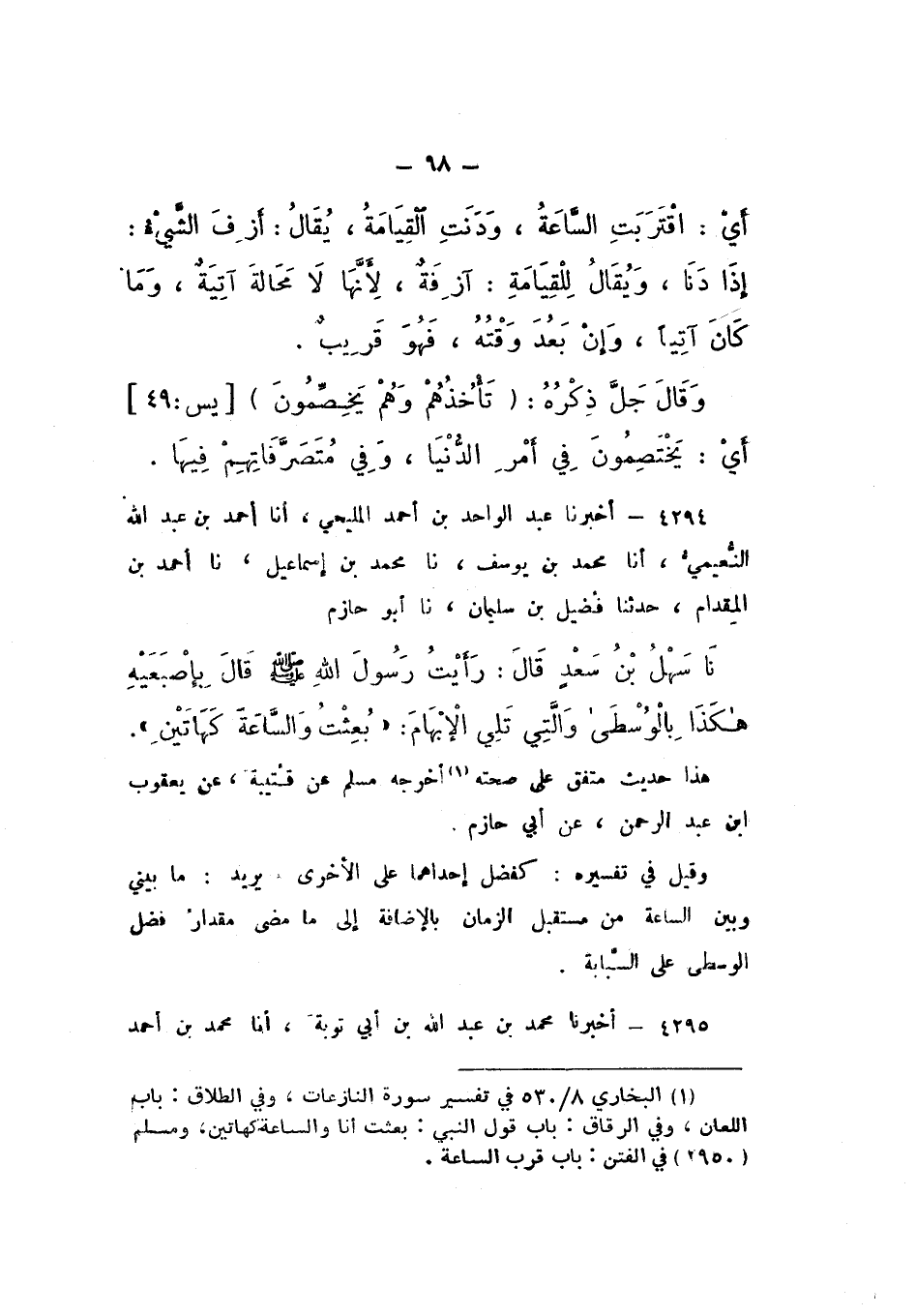 4294 - أَخْبَرَنَا عَبْدُ الْوَاحِدِ بْنُ أَحْمَدَ الْمَلِيحِيُّ، أَنَا أَحْمَدُ بْنُ عَبْدِ اللَّهِ النُّعَيْمِيُّ، أَنَا مُحَمَّدُ بْنُ يُوسُفَ، نَا مُحَمَّدُ بْنُ إِسْمَاعِيلَ، نَا أَحْمَدُ بْنُ الْمِقْدَامِ، حَدَّثَنَا فُضَيْلُ بْنُ سُلَيْمَانَ، نَا أَبُو حَازِمٍ، نَا سَهْلُ بْنُ سَعْدٍ، قَالَ: رَأَيْتُ رَسُولَ اللَّهِ صَلَّى اللهُ عَلَيْهِ وَسَلَّمَ قَالَ بِإِصْبَعَيْهِ هَكَذَا بِالْوُسْطَى وَالَّتِي تَلِي الإِبْهَامَ: «بُعِثْتُ وَالسَّاعَةَ كَهَاتَيْنِ».