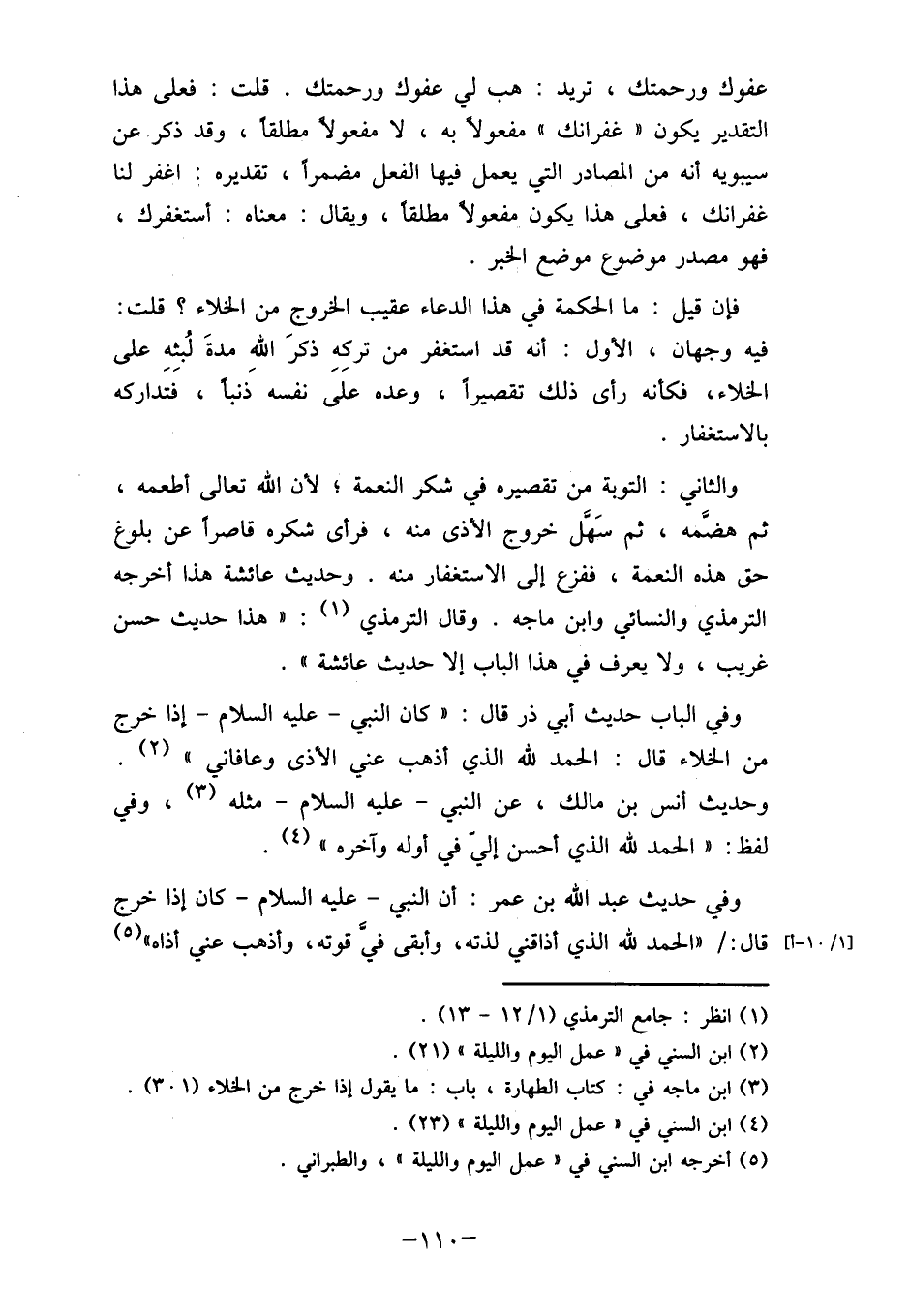 من الخلاء قال: الحمد لله الذي أذهب عني الأذى وعافاني " (2) .