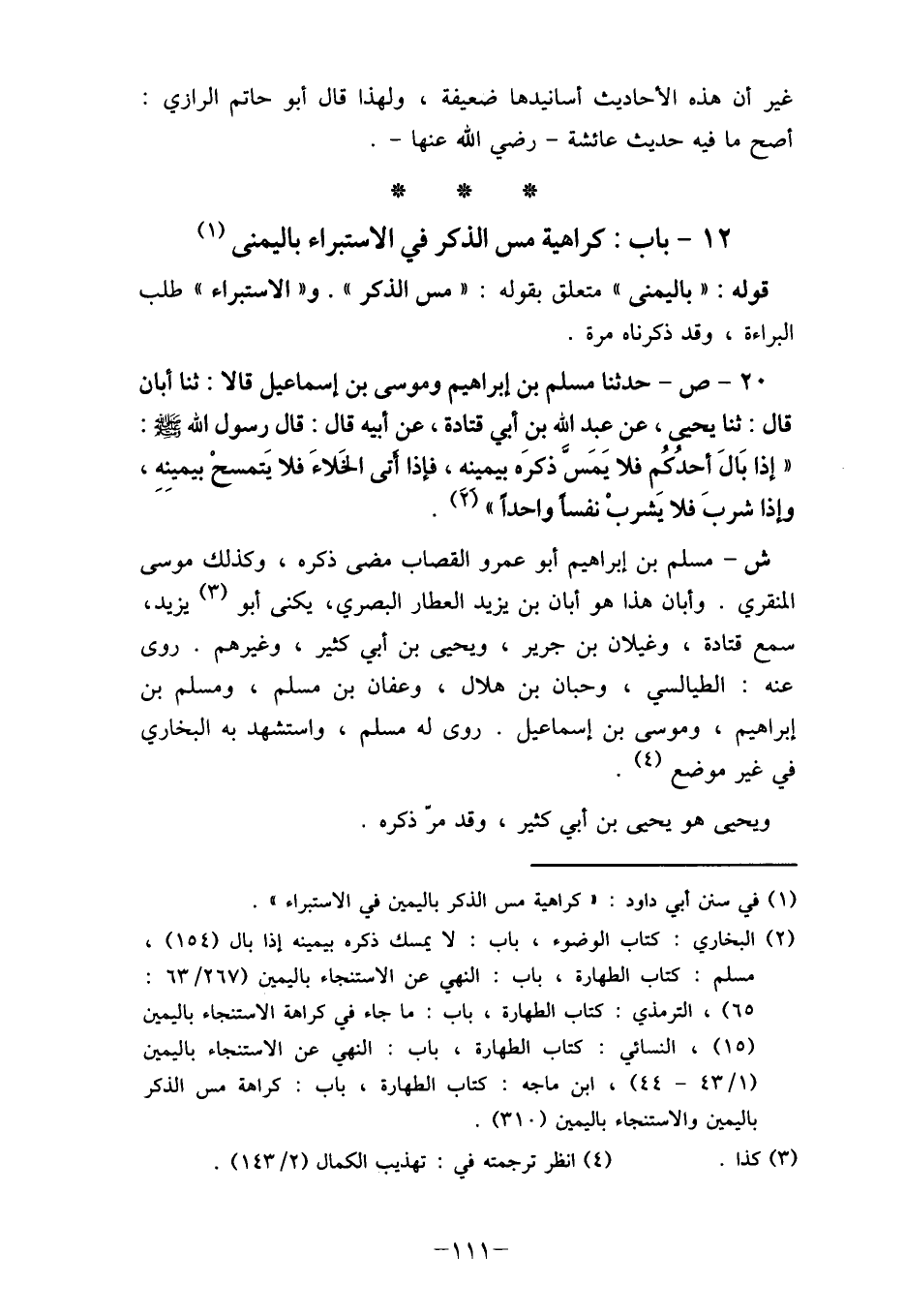 (1) في سنن أبي داود: " كراهية مس الذكر باليمين في الاستبراء ".