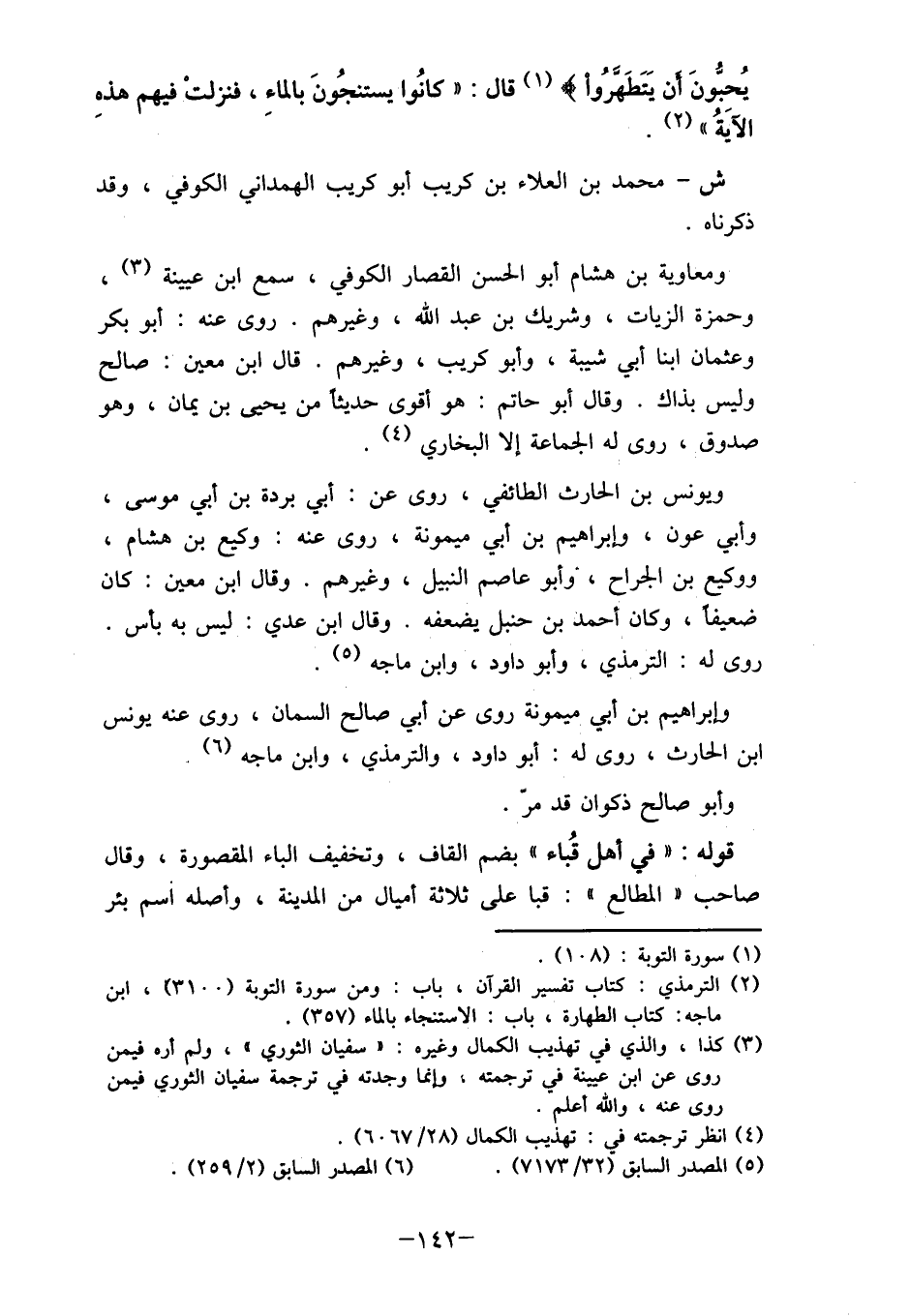 يُحبُّون أن يتطهرُوا ((1) قال: " كانُوا يستنجُون بالماء، فنزلتْ فيهم هذه