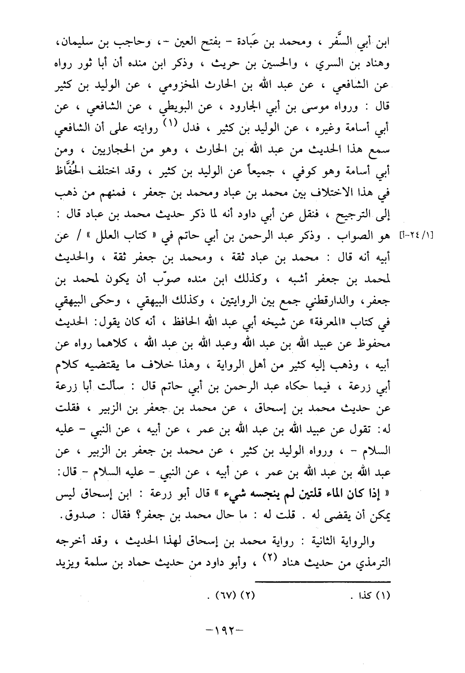 " إذا كان الماء قلتين لم ينجسه شيء " قال أبو زرعة: ابن إسحاق ليس