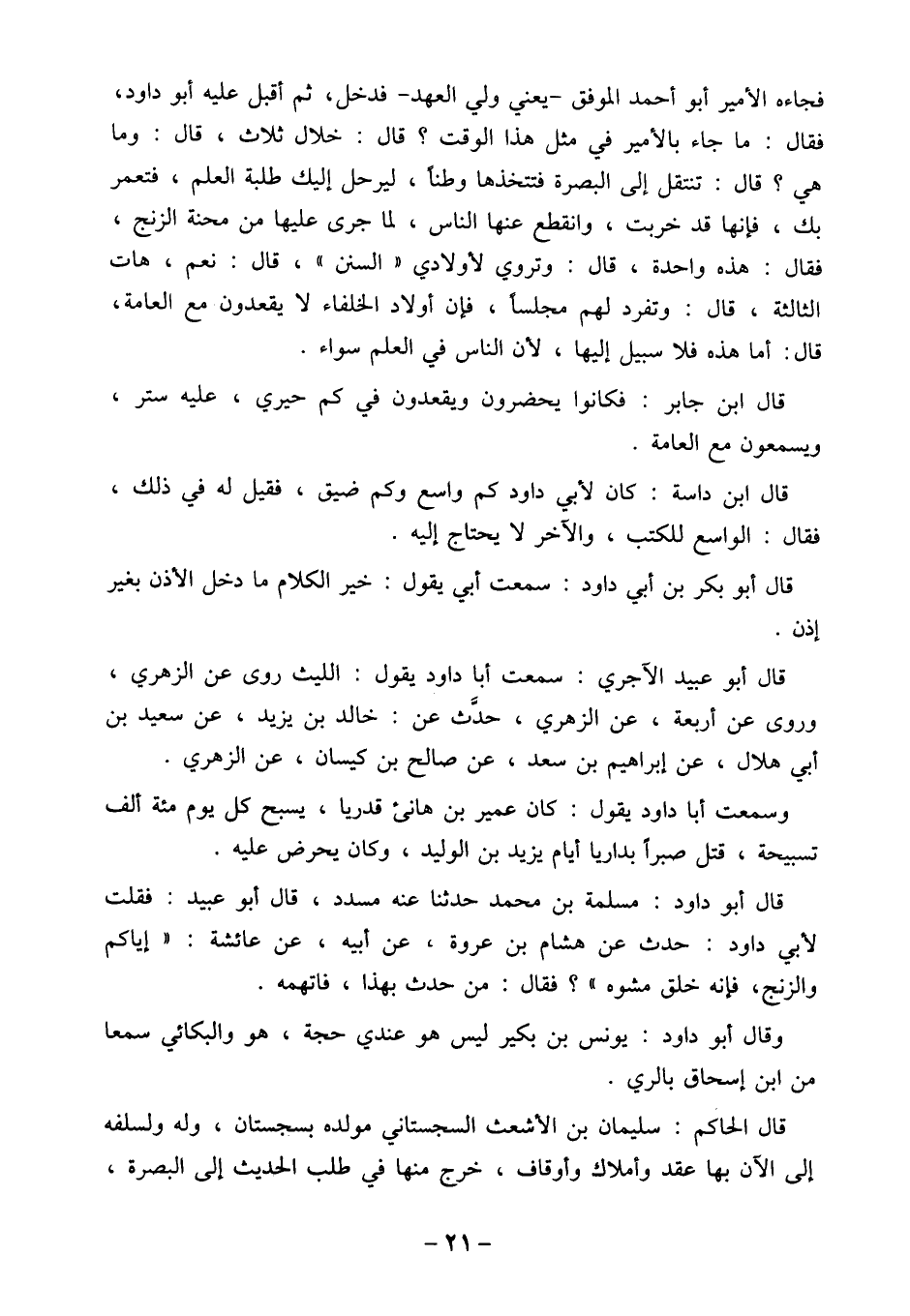 فجاءه الأمير أبو أحمد الموفق- يعني ولي العهد- فدخل، ثم أقبل عليه أبو داود،