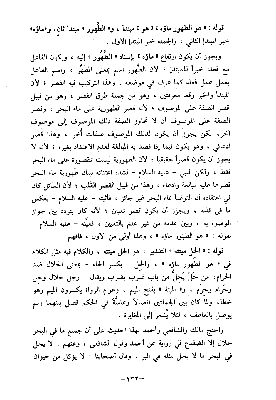 قوله: " هو الطهور ماؤه " " هو " مبتدأ، و " الطهور " مبتدأ ثان، و " ماؤه"