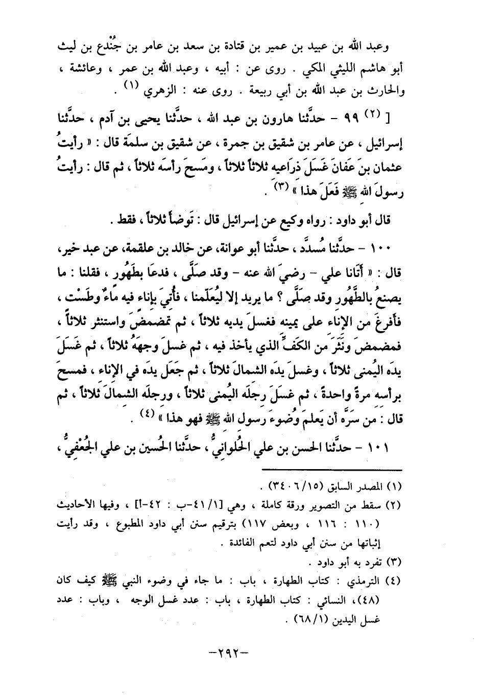 (4) الترمذي: كتاب الطهارة، باب: ما جاء في وضوء النبي صَلَّى اللَّهُ عَلَيْهِ وَسَلَّمَ كيف كان