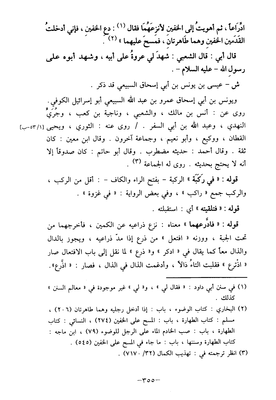 أدراعاً، ثم أهويتُ إلى الخفين لأنزعهُما فقال (1) : دع الخفين، فإني أدخلتُ