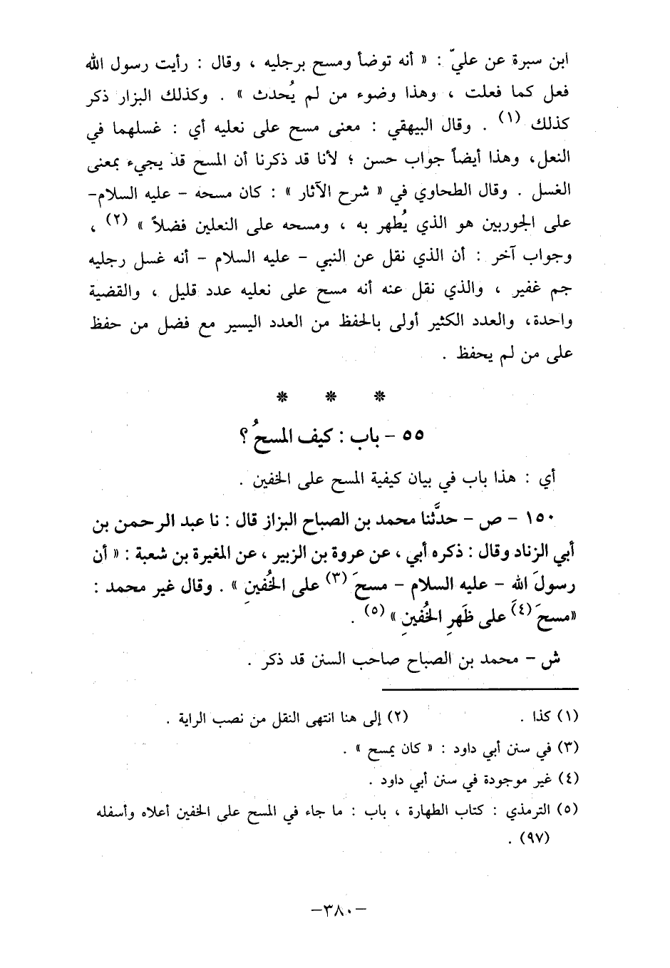 (5) الترمذي: كتاب الطهارة، باب: ما جاء في المسح على الخفين أعلاه وأسفله