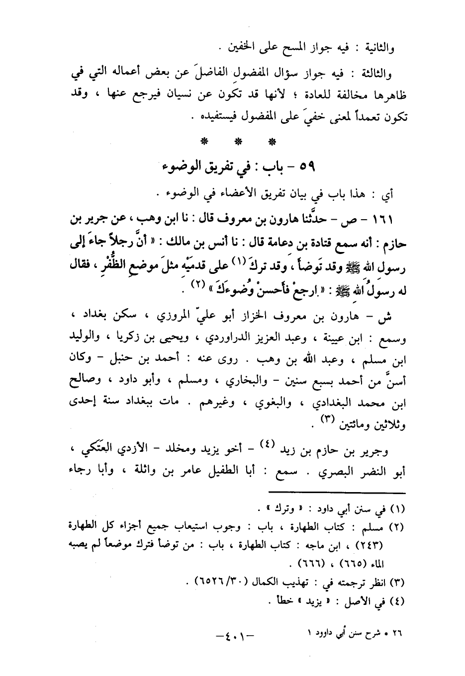 (243) ، ابن ماجه: كتاب الطهارة، باب: من توضأ فترك موضعاً لم يصبه