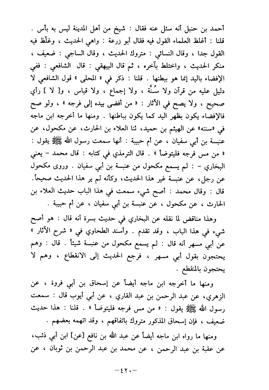وهذا مناقض لما نقله عن البخاري في حديث بسرة أنه قال: هو أصح