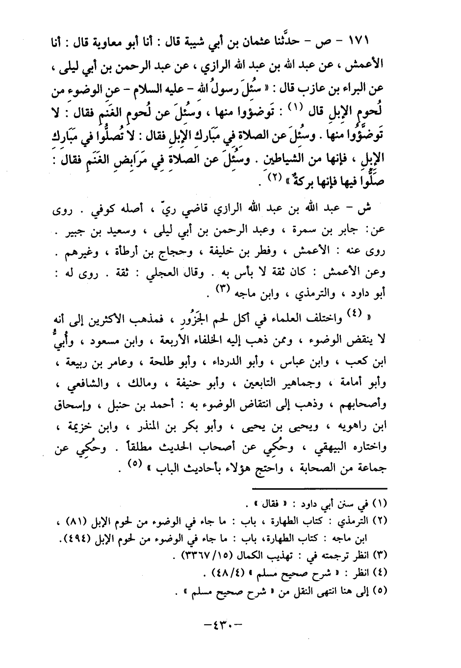 " (4) واختلف العلماء في أكل لحم الجزُور، فمذهب الأكثرين إلى أنه