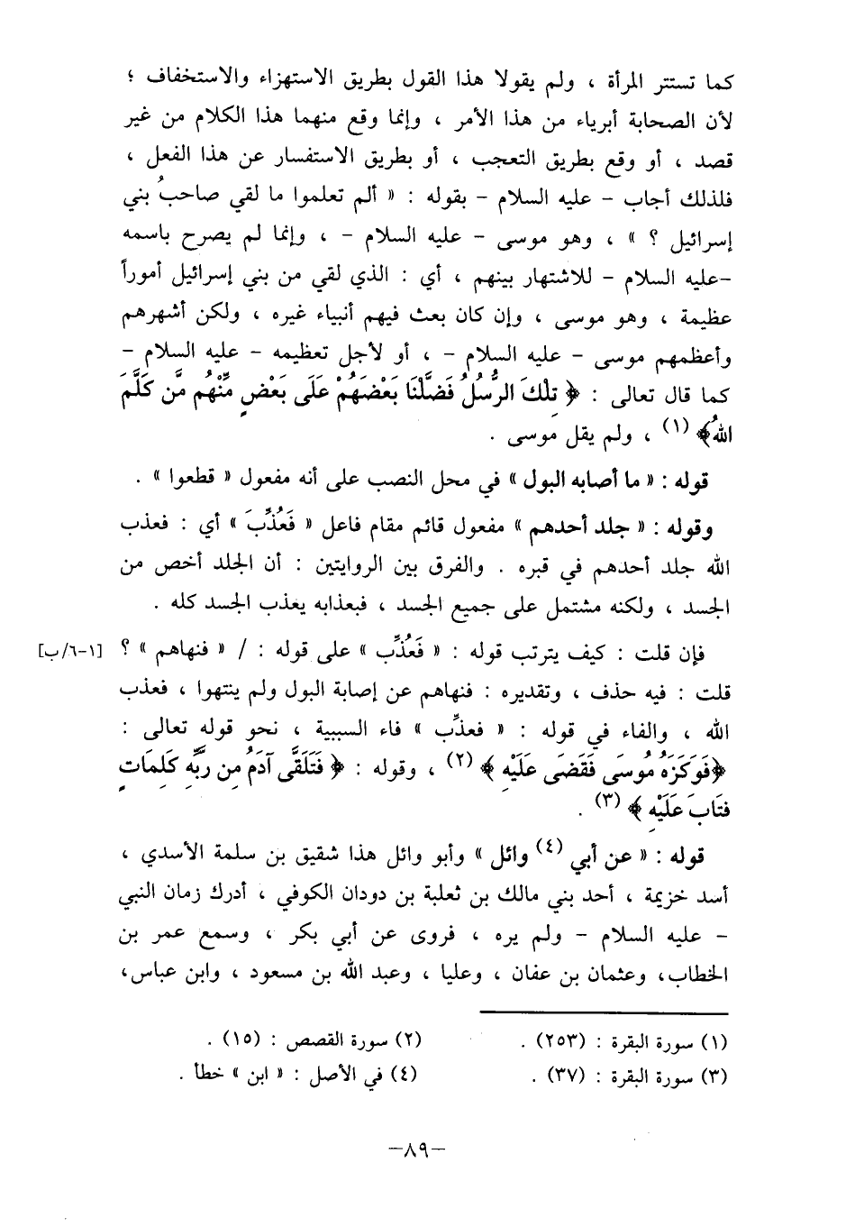 فلذلك أجاب- عليه السلام- بقْوله: " ألم تعلموا ما لقي صاحبُ بني